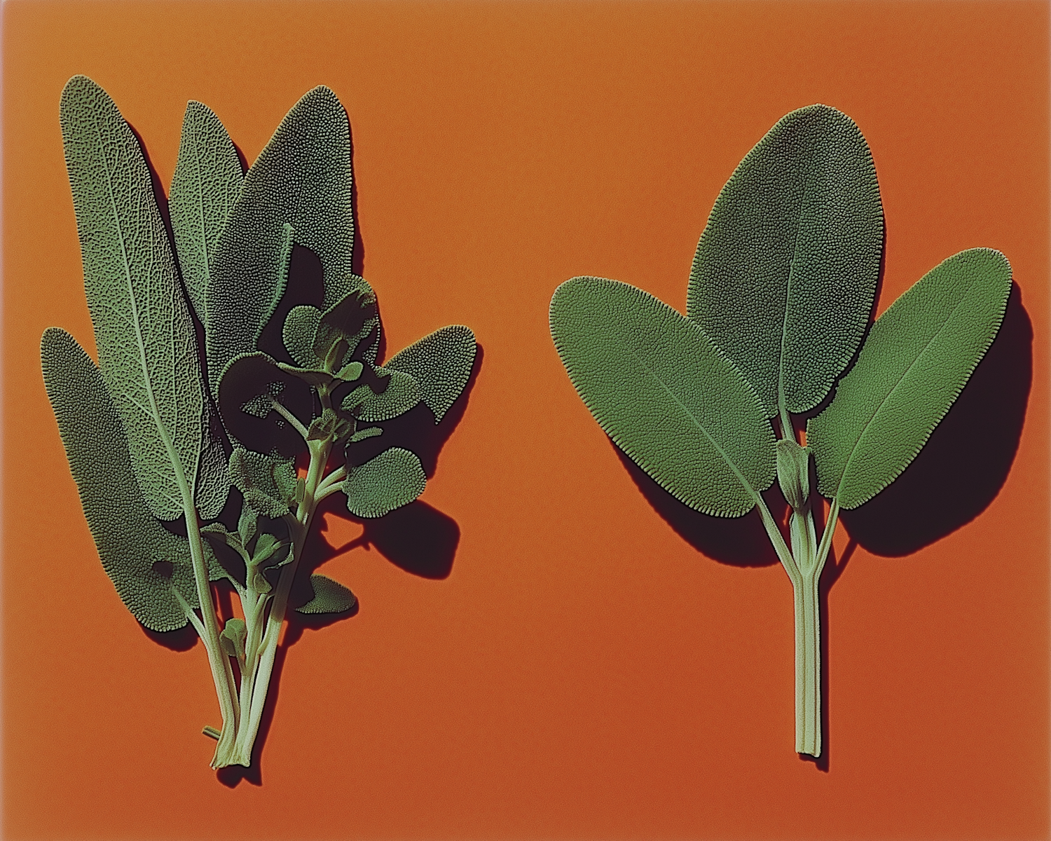 Vibrant green sage leaves on an orange background, showcasing texture and contrast.