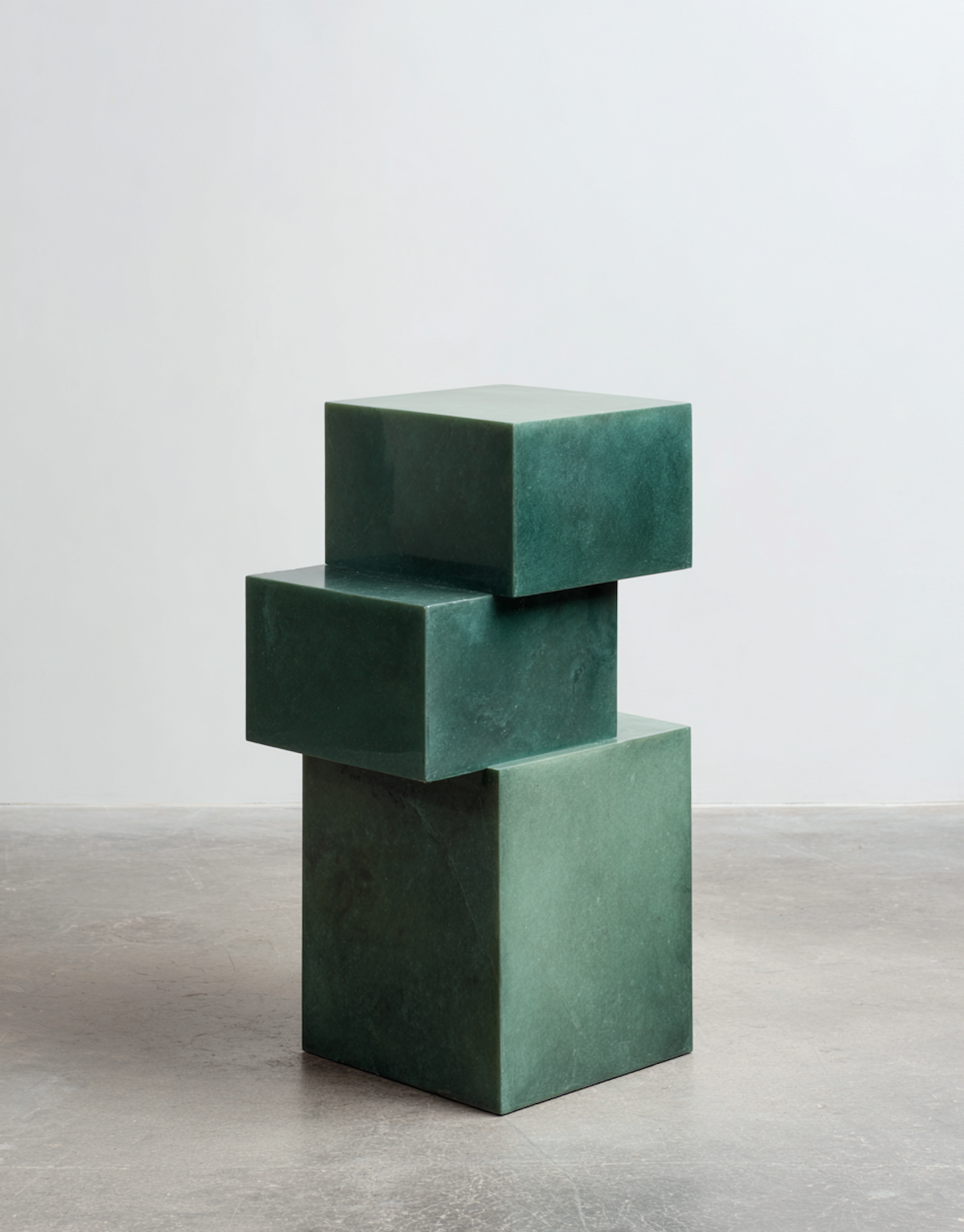 A modern sculpture of three green marble cubes stacked asymmetrically on a plain background.