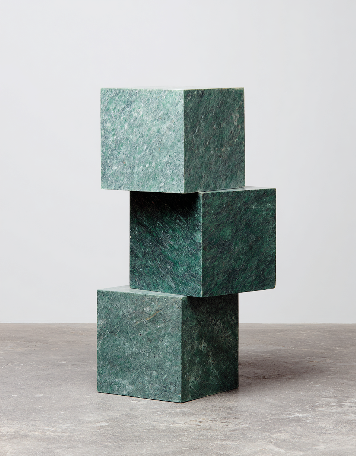 A modern sculpture of three green marble cubes stacked in an offset arrangement, showcasing a sleek and minimalist design.