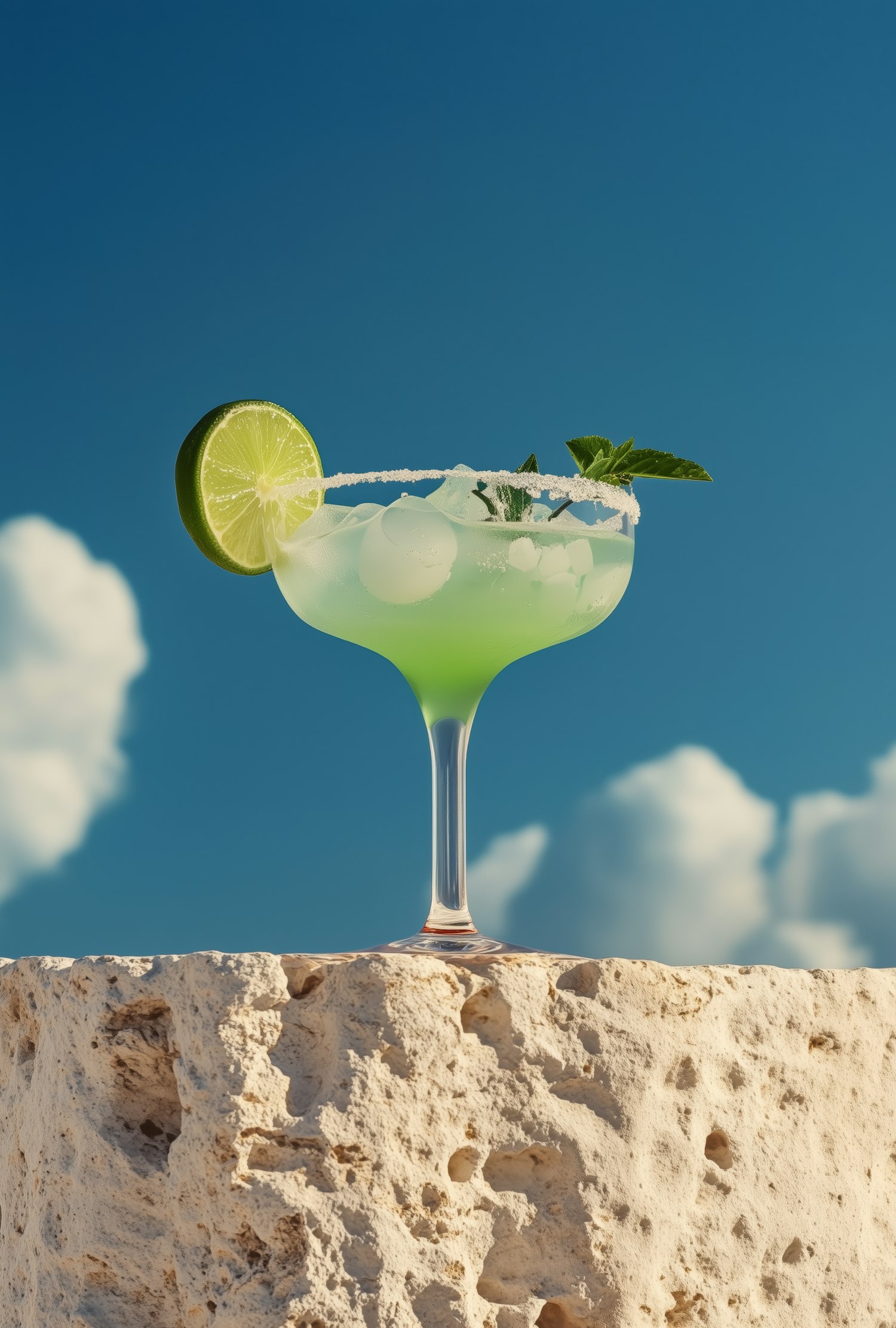 A refreshing green cocktail with lime and mint, served in a salt-rimmed glass against a clear blue sky and soft clouds.