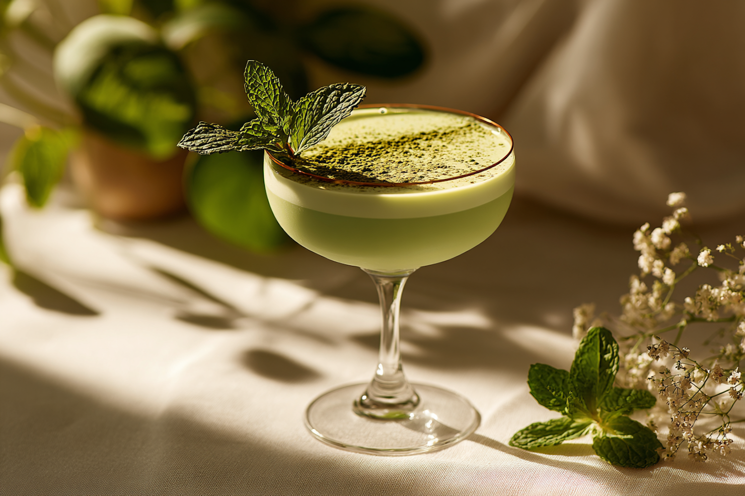 A creamy green cocktail in a coupe glass, garnished with mint and matcha powder, set against a soft, natural light background.