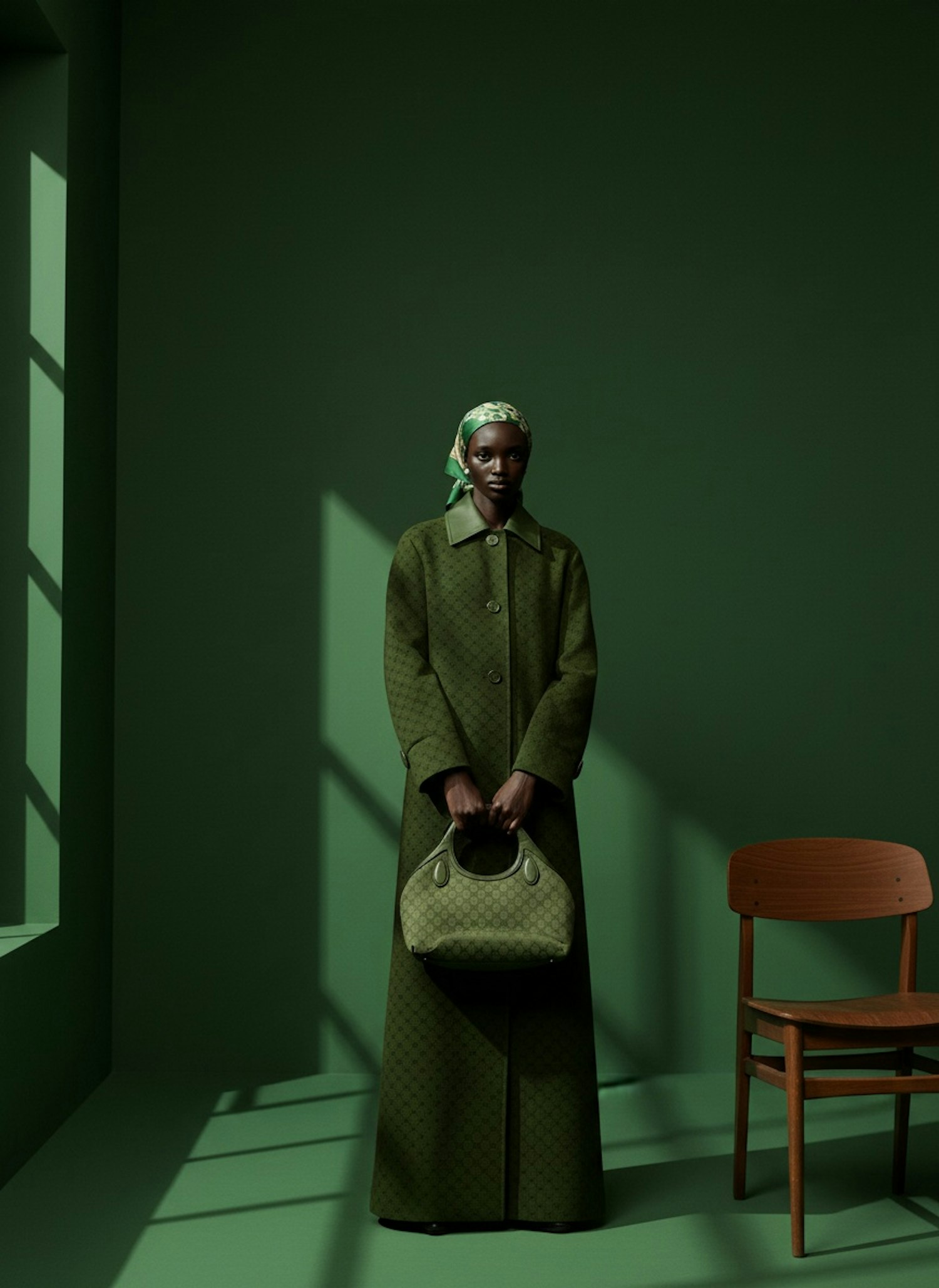 A person in a green coat and headscarf holds a matching handbag in a minimalist green room with geometric shadows.
