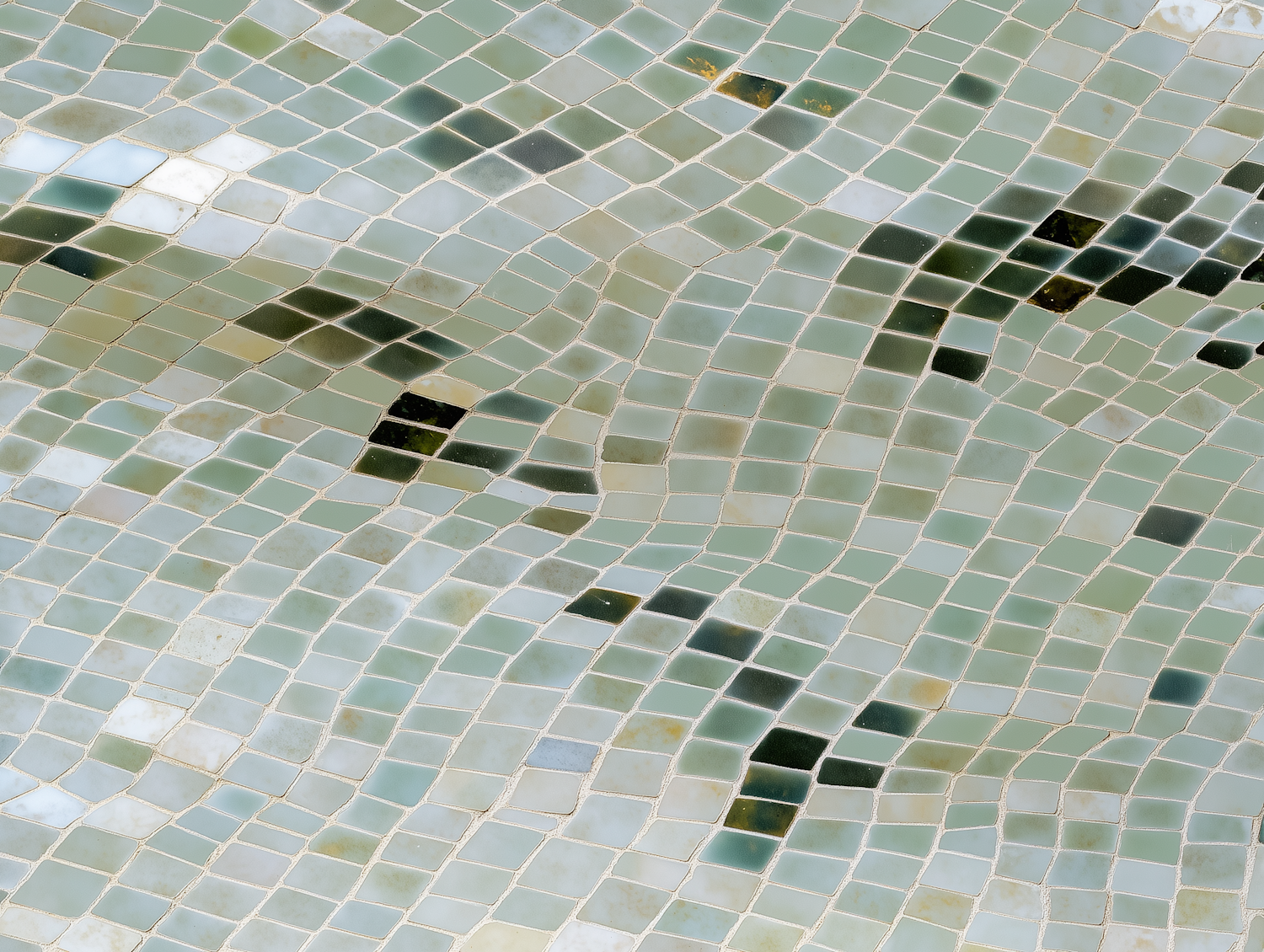 A wavy mosaic of green tiles in varying shades, creating a textured and dynamic pattern with glossy and matte finishes.