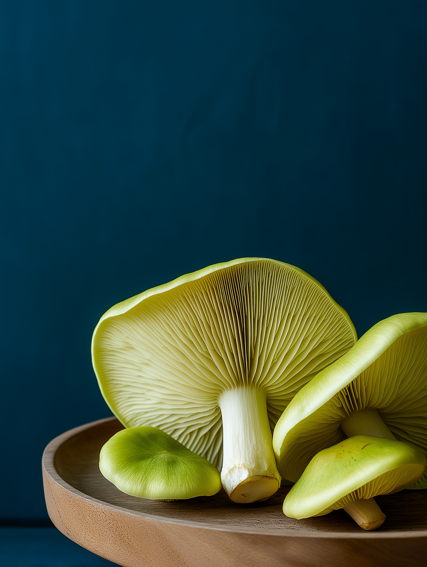 A close-up of green mushrooms with detailed gills on a wooden plate against a dark teal background, showcasing their texture and form.