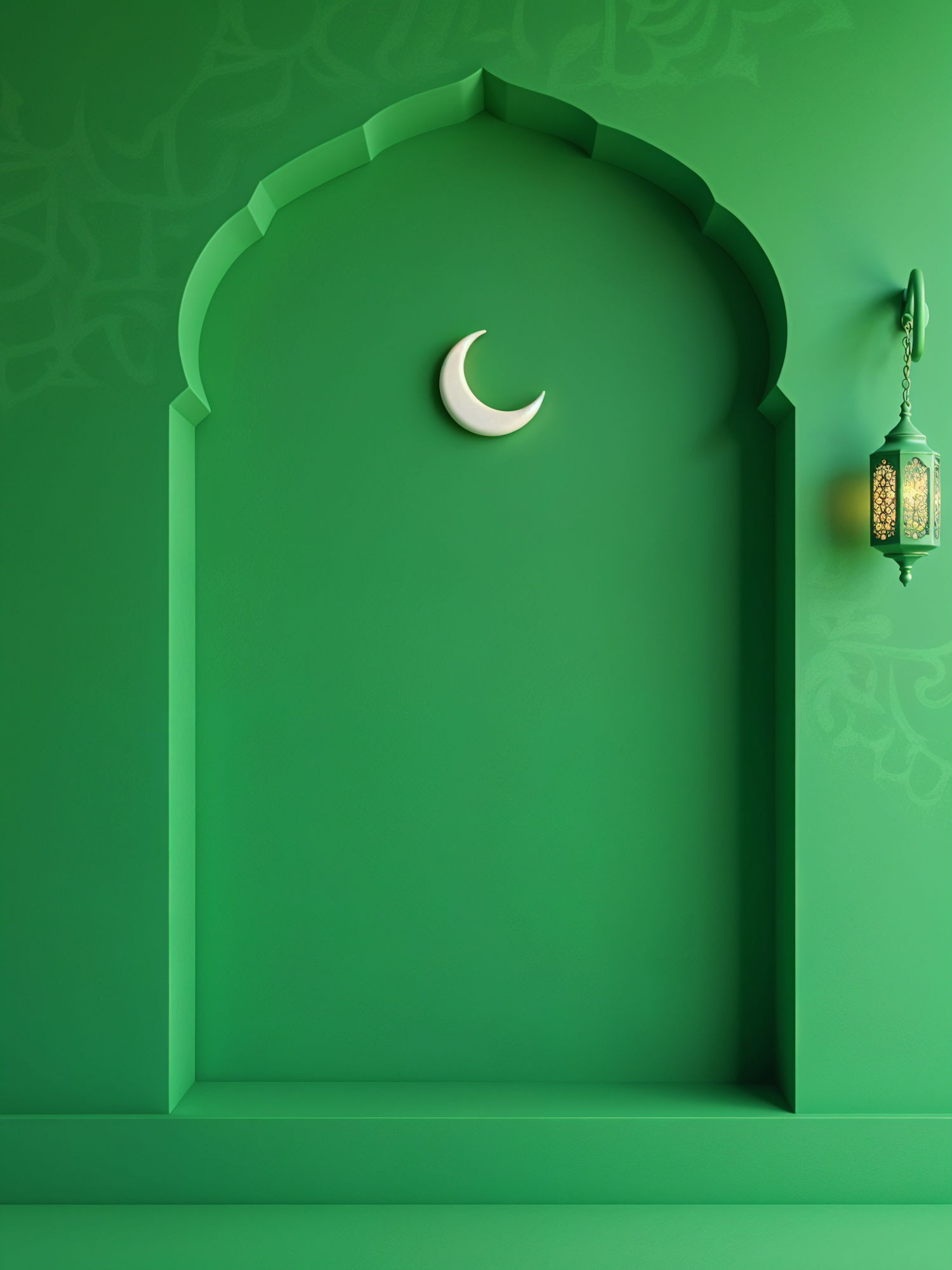 Minimalist green wall with crescent moon and glowing lantern, evoking Islamic art and serene spirituality.