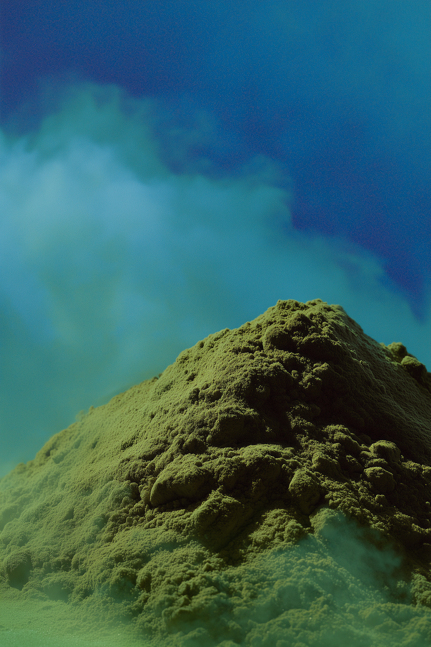 A surreal close-up of a green powder mound with a misty haze and a vibrant blue background, creating a dramatic and mysterious atmosphere.