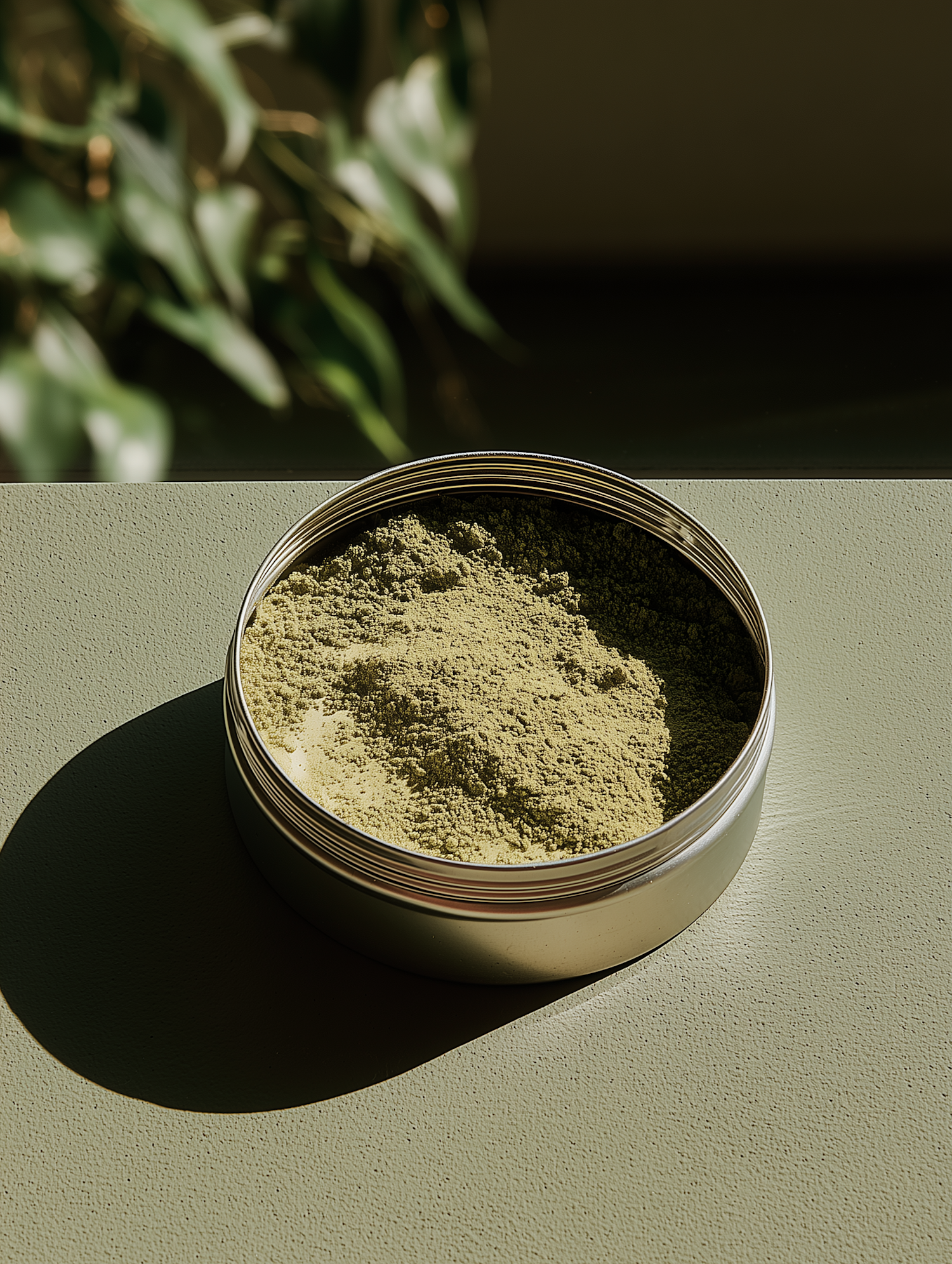 A tin of fine green powder on a textured surface, with soft lighting and blurred foliage in the background for a natural aesthetic.