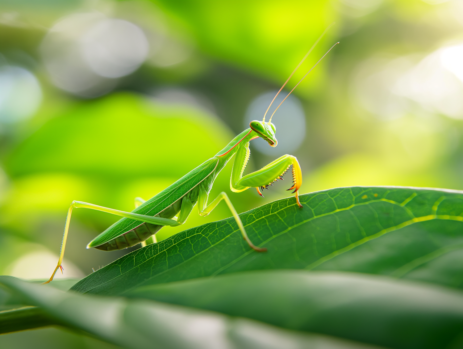 A vivid green praying mantis perched on a leaf, surrounded by sunlit greenery, showcasing its natural camouflage and elegance.