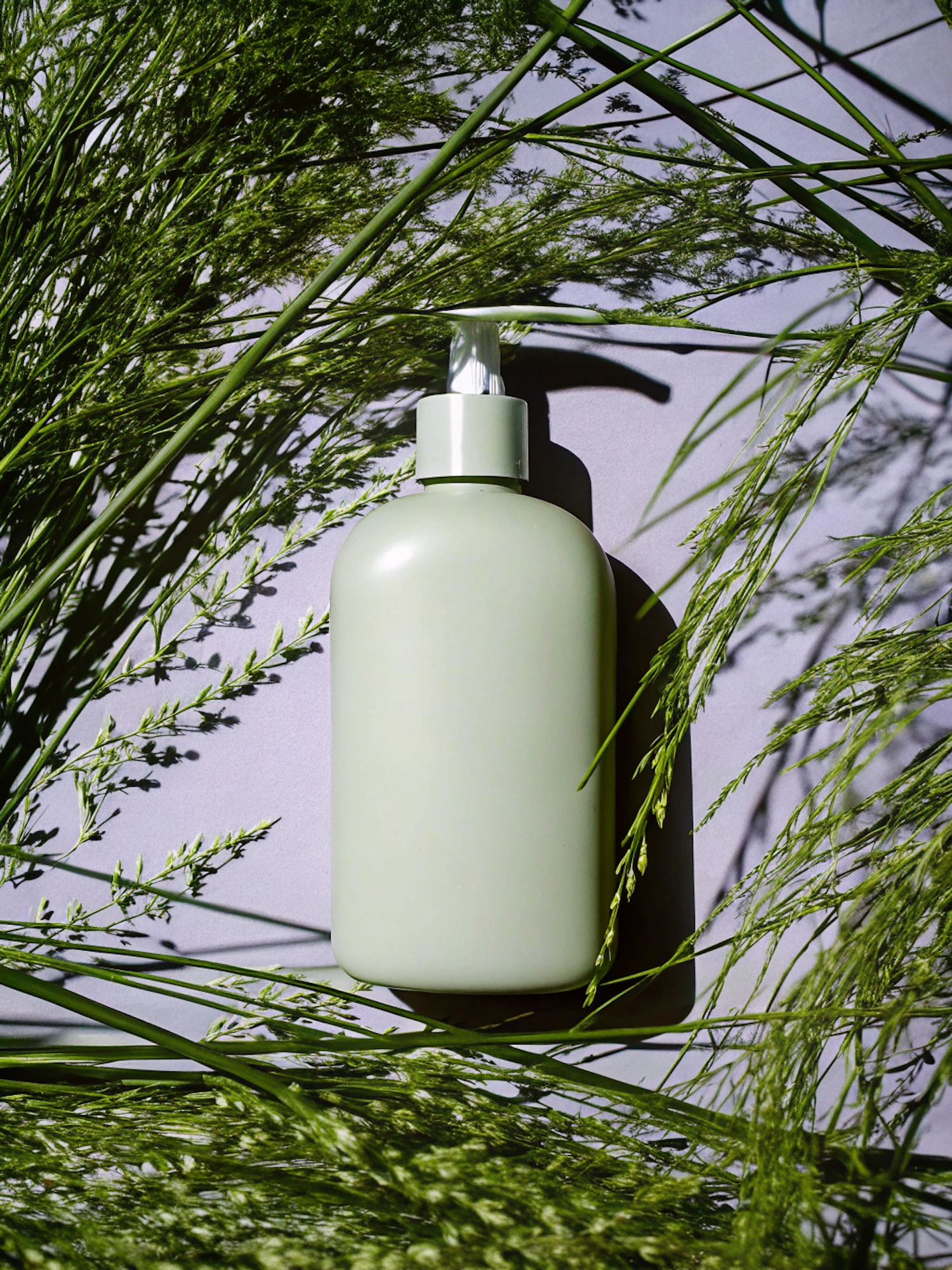 Minimalist green pump bottle surrounded by lush foliage on a neutral gray background, evoking a natural and eco-friendly vibe.