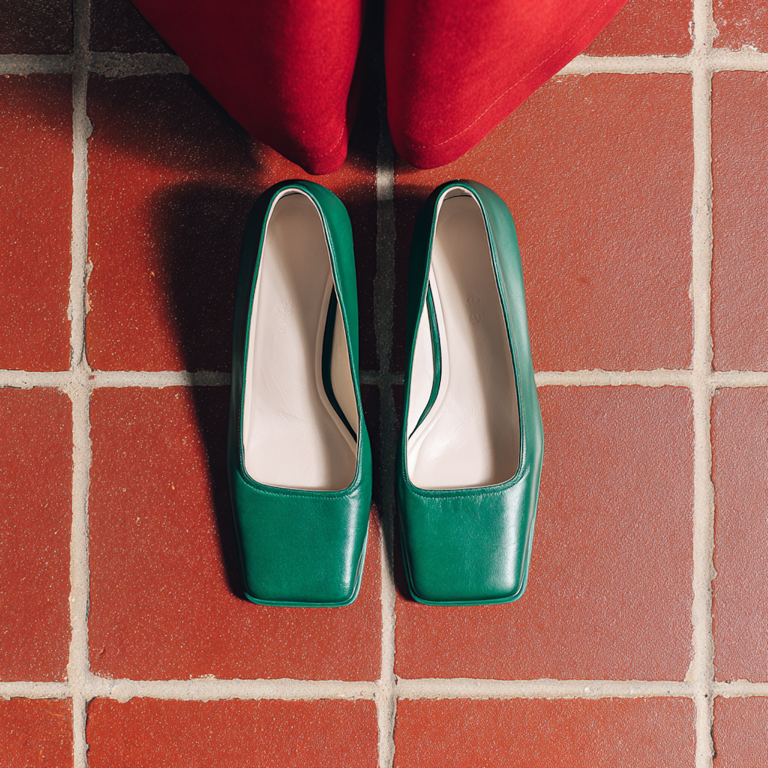 Stylish green square-toe shoes on a red tiled floor, paired with a red fabric accent for a bold and modern aesthetic.