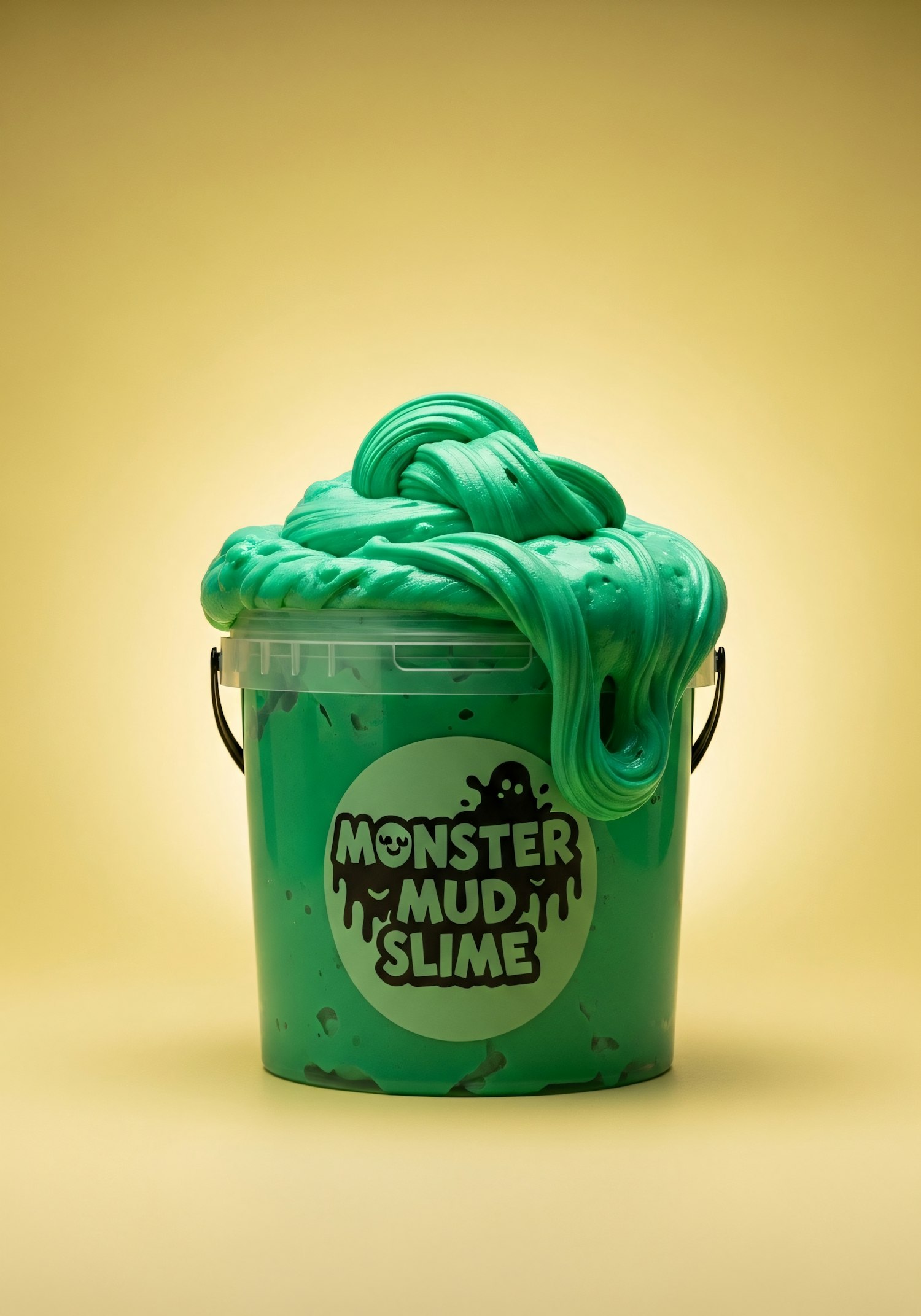 A bucket of green slime labeled 'Monster Mud Slime' with a playful design, set against a warm yellow background.