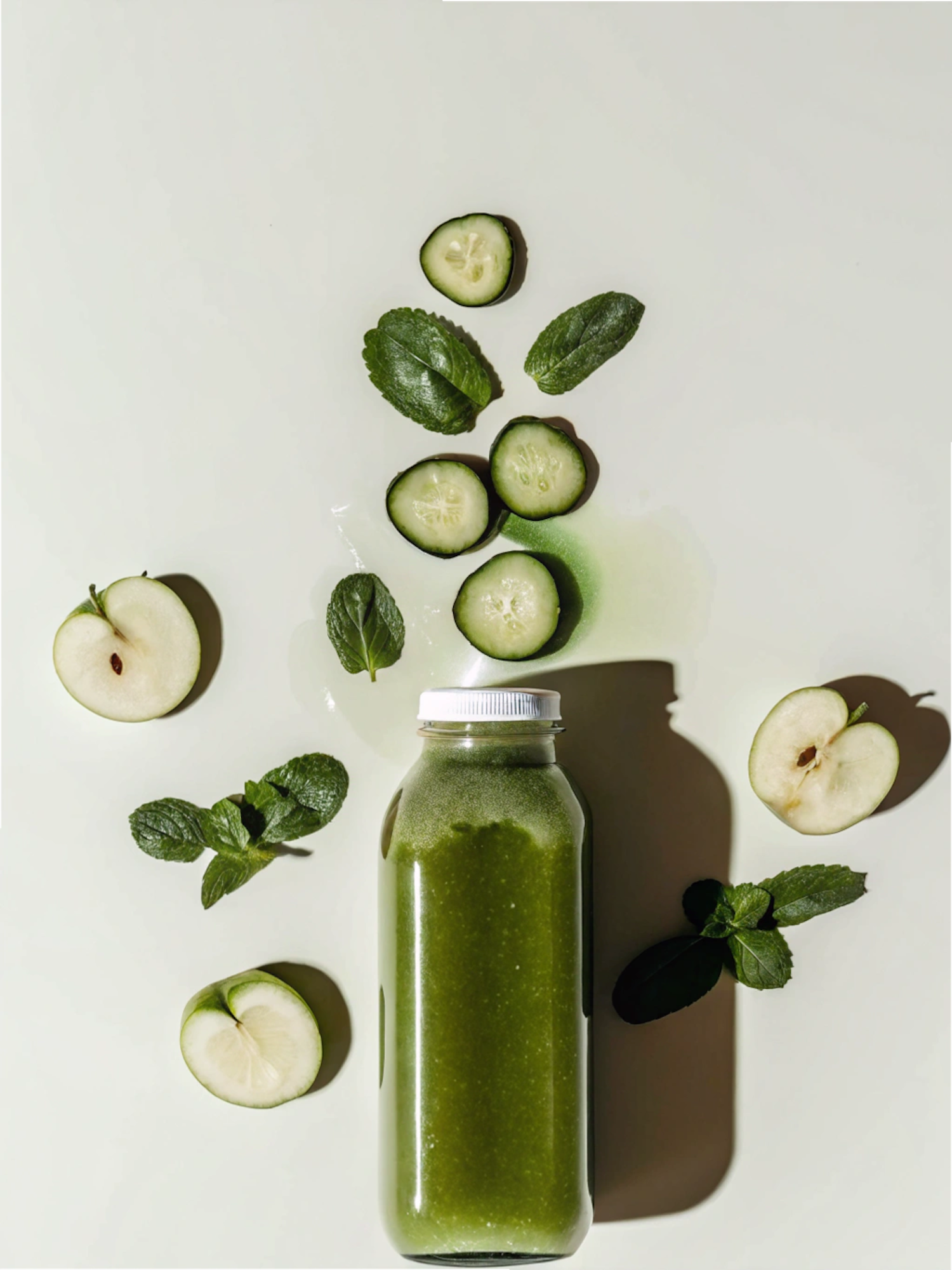 A vibrant green smoothie bottle surrounded by fresh cucumber slices, green apple halves, and mint leaves on a light background.