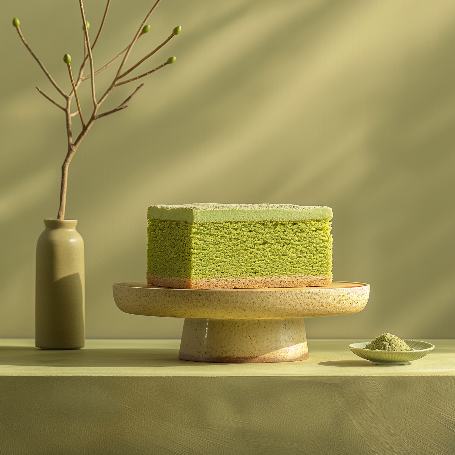 Elegant matcha cake on a ceramic stand with a minimalist vase and matcha powder dish, set against a muted green background.