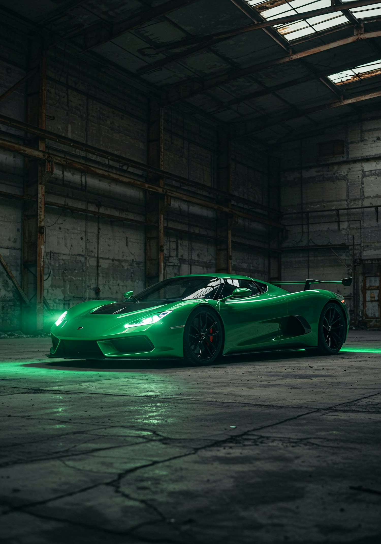 A stunning green sports car with glowing headlights in a gritty industrial warehouse, showcasing sleek design and vibrant color contrast.