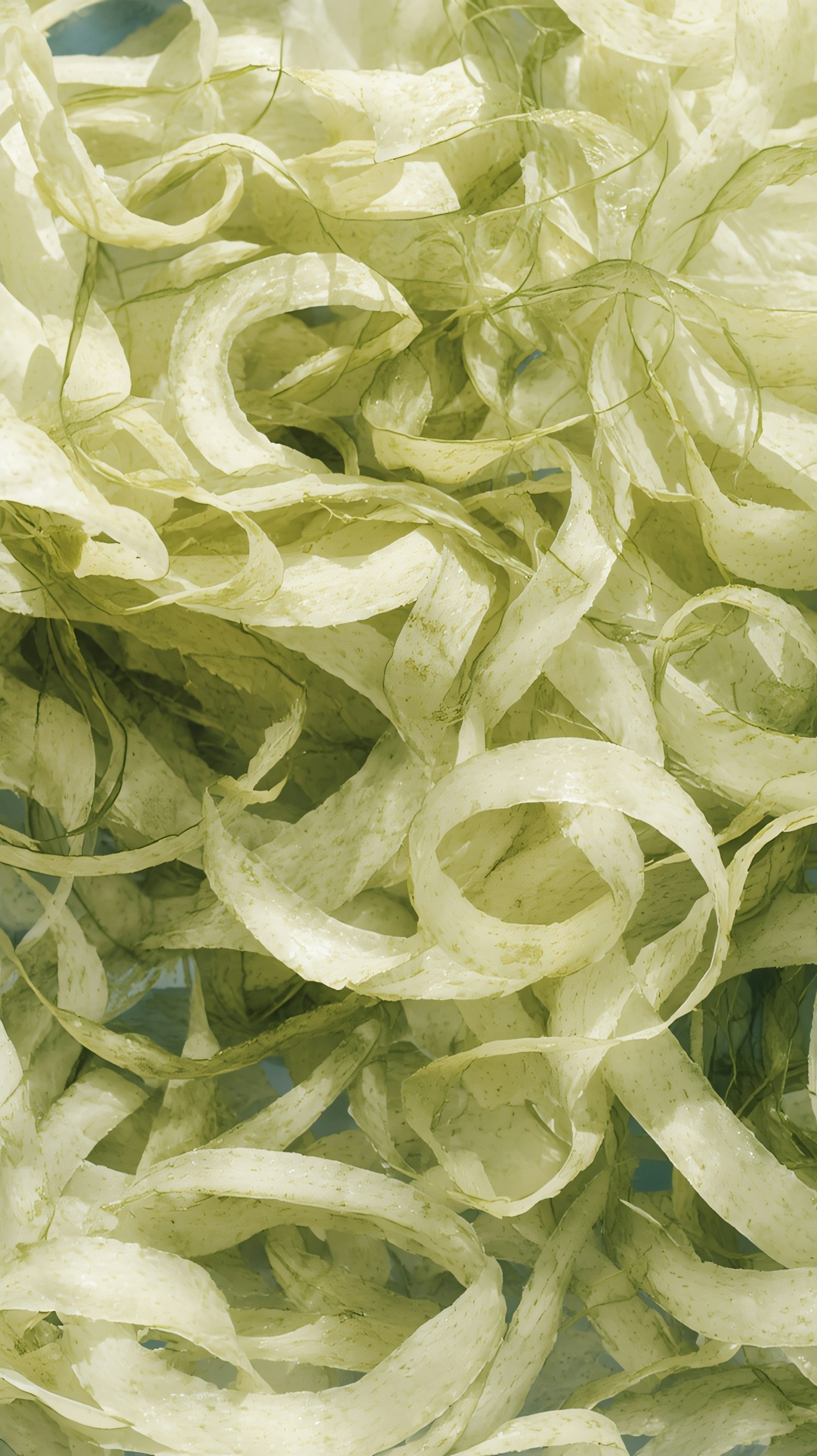 Close-up of light green, translucent, curly strips resembling seaweed or vegetable shavings, showcasing intricate textures and patterns.