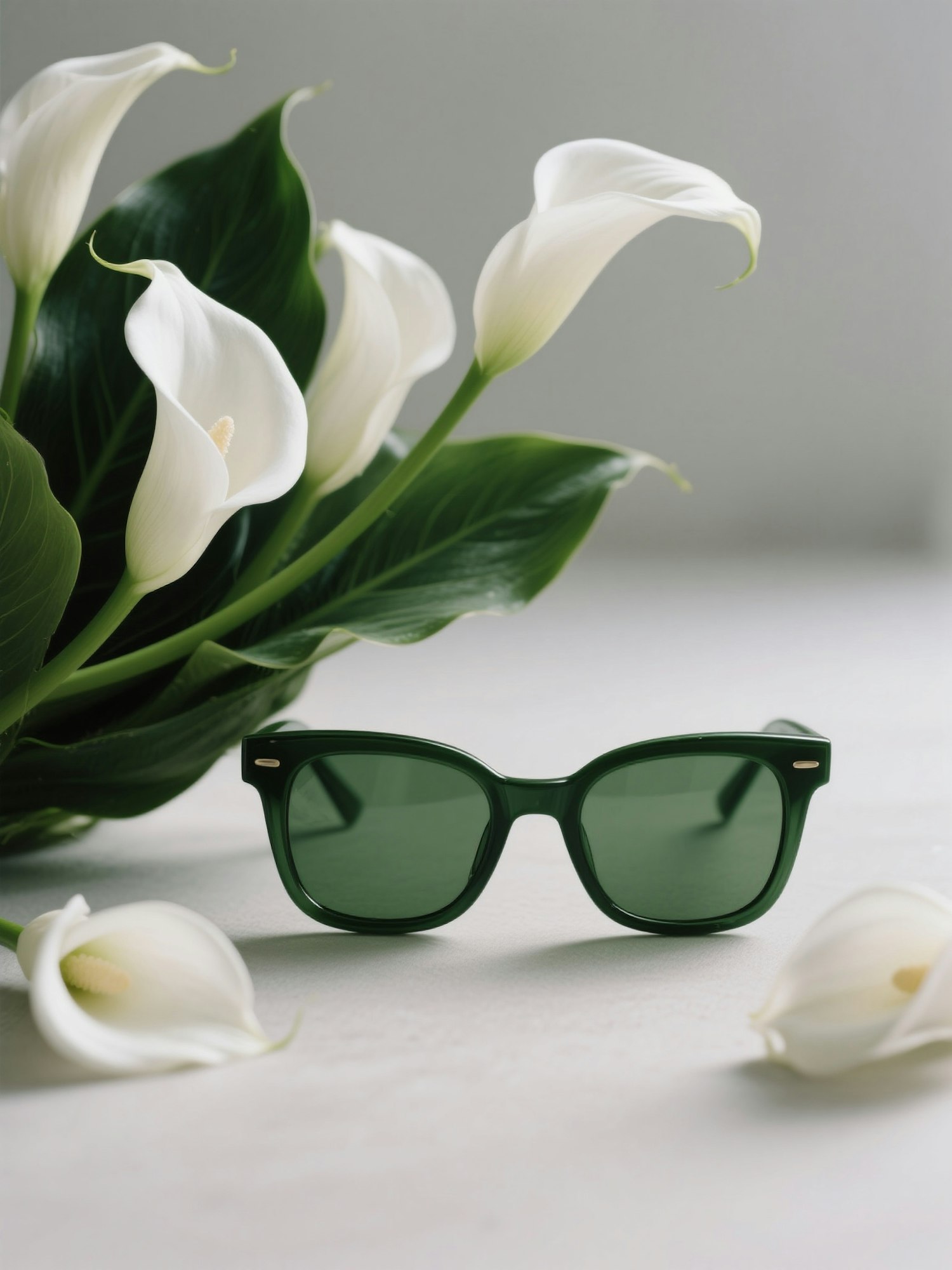 — rectangular sunglasses with deep forest-green tinted lenses, displayed alongside white calla lilies and deep green leaves, flowers leaning gracefully toward the frame without intersecting the glass