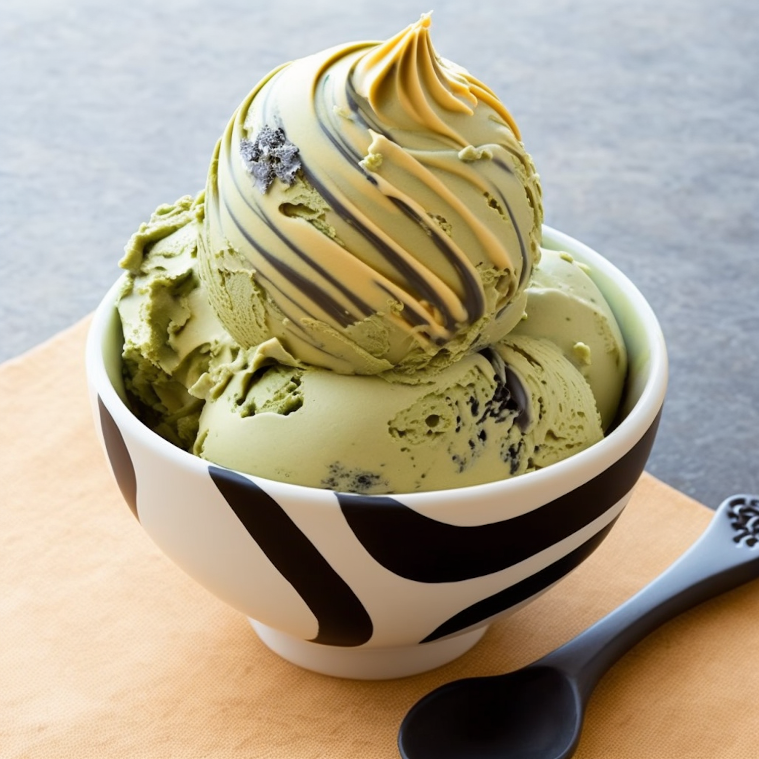 Delicious matcha ice cream with chocolate and caramel swirls in a stylish black and white bowl, accompanied by a black spoon.