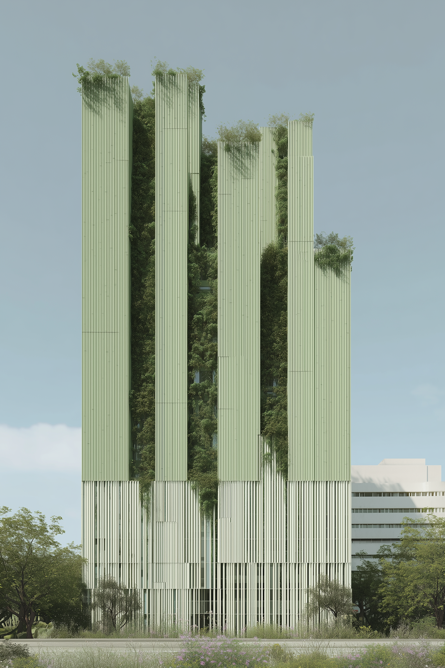 A modern green building with vertical panels and integrated vegetation, blending architecture and nature in a sustainable design.