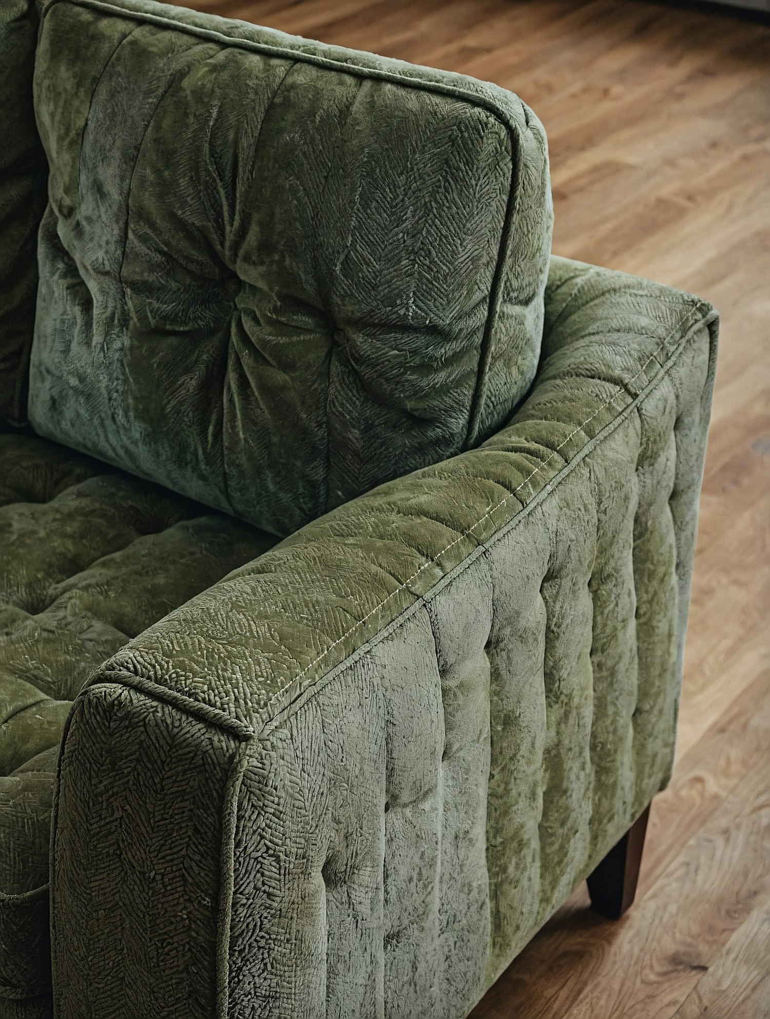 Close-up of a green velvet tufted sofa with herringbone texture, button details, and wooden legs on a warm-toned wooden floor.