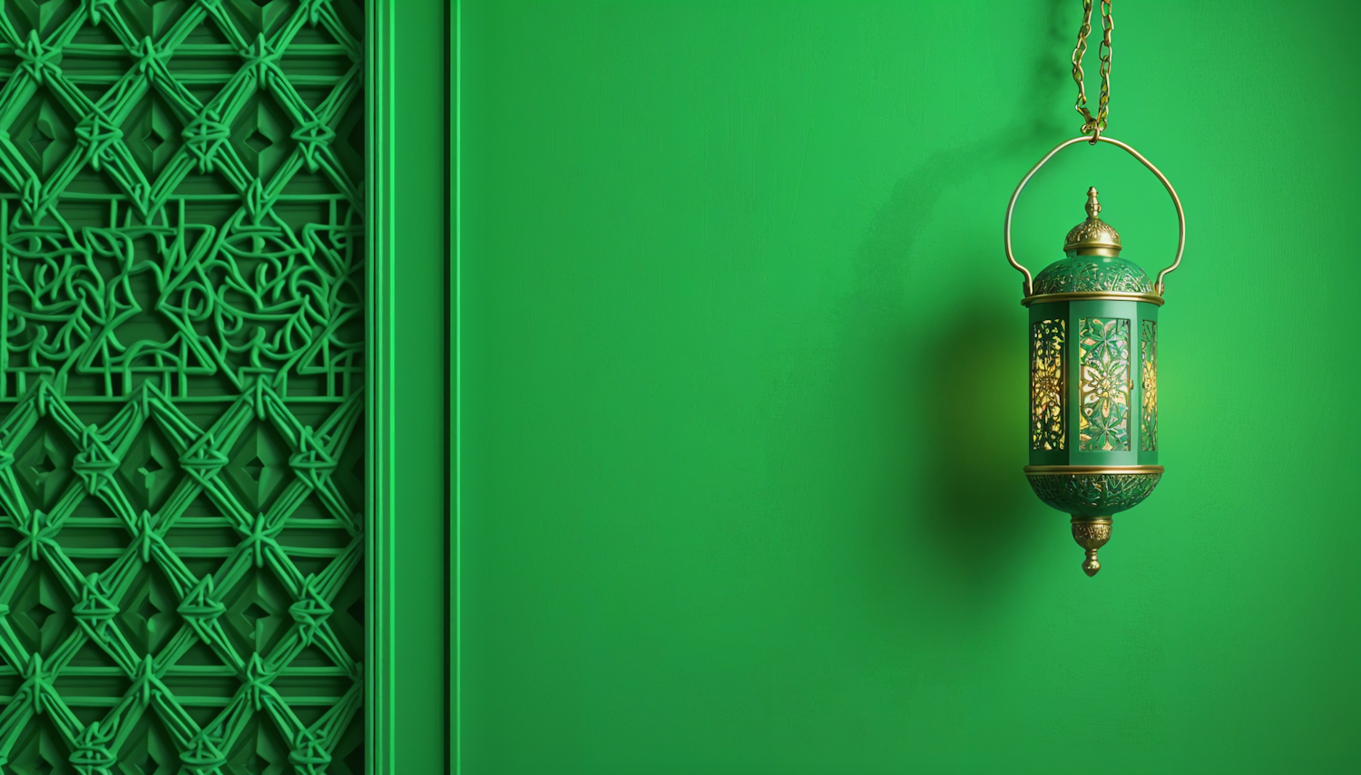 Elegant green wall with a glowing gold-accented lantern and intricate geometric patterns, blending tradition and artistry beautifully.