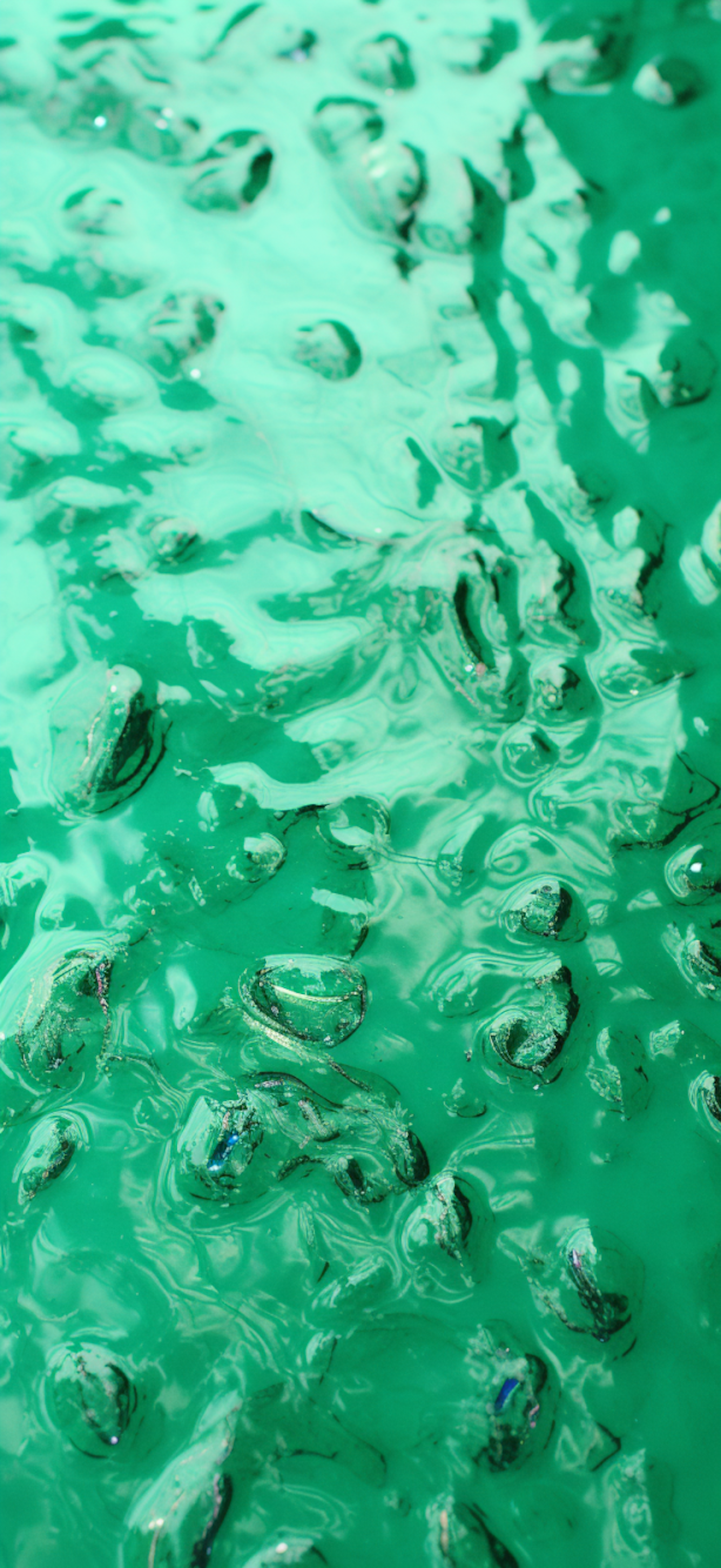 Abstract close-up of a glossy green surface with embedded objects, creating a vibrant and textured visual effect.