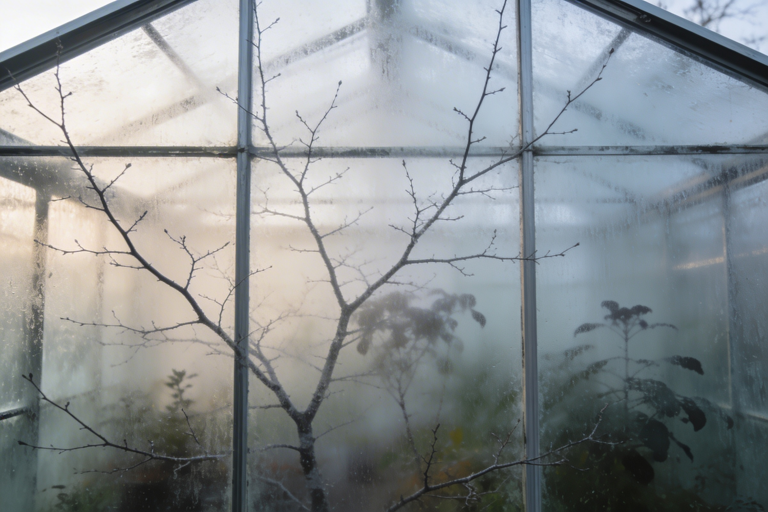 A foggy greenhouse with a silhouetted tree and blurred plants inside, creating a serene and mysterious atmosphere.