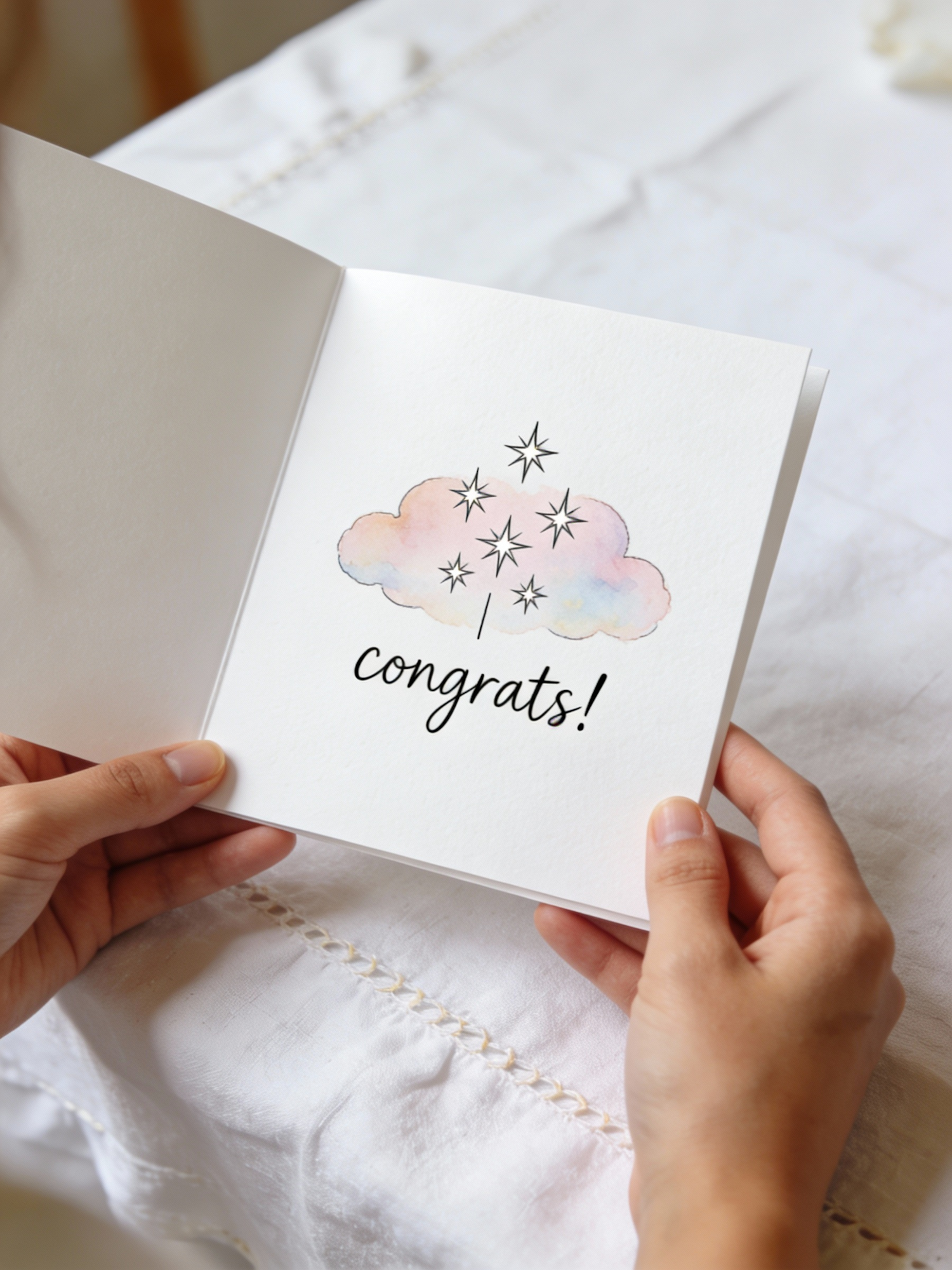 a hand-drawn greeting card with the text "congrats!" and a simple line art illustration of small sparkling stars with a gentle pastel watercolor cloud behind them, minimalistic style, holding the card in one's hands, white linen tablecloth background, card slightly open, soft daylight, realistic photo, no extra text, no logos, no watermark