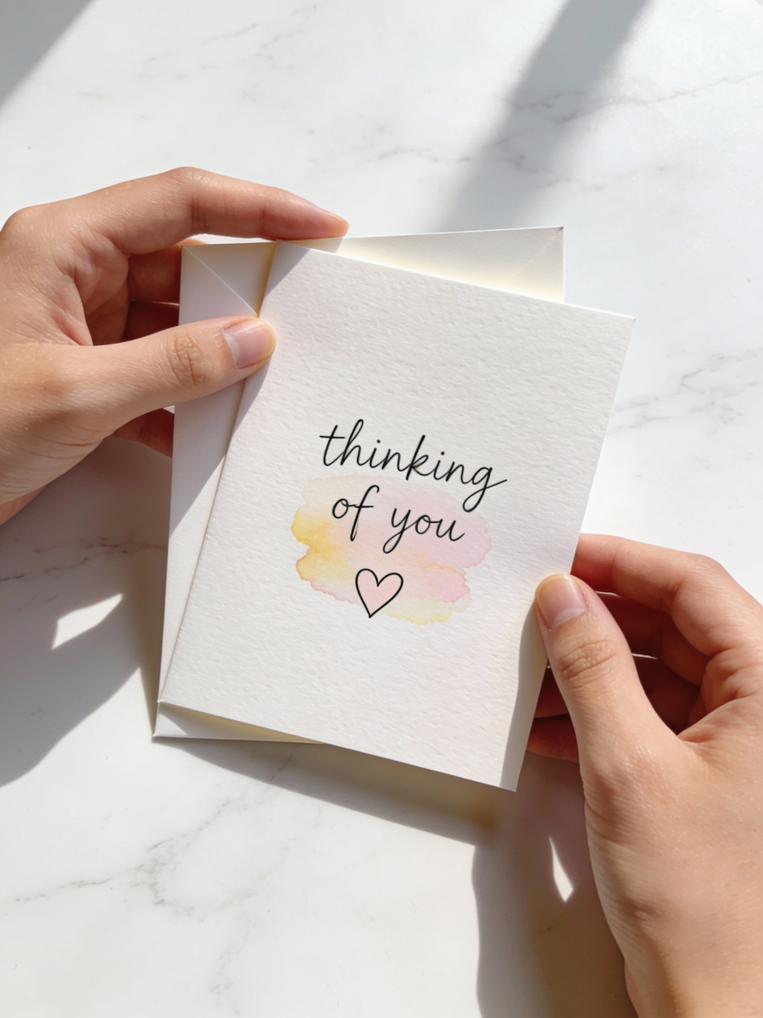 A close-up of hands holding a 'thinking of you' card with pastel watercolor design, set against a white marble background.