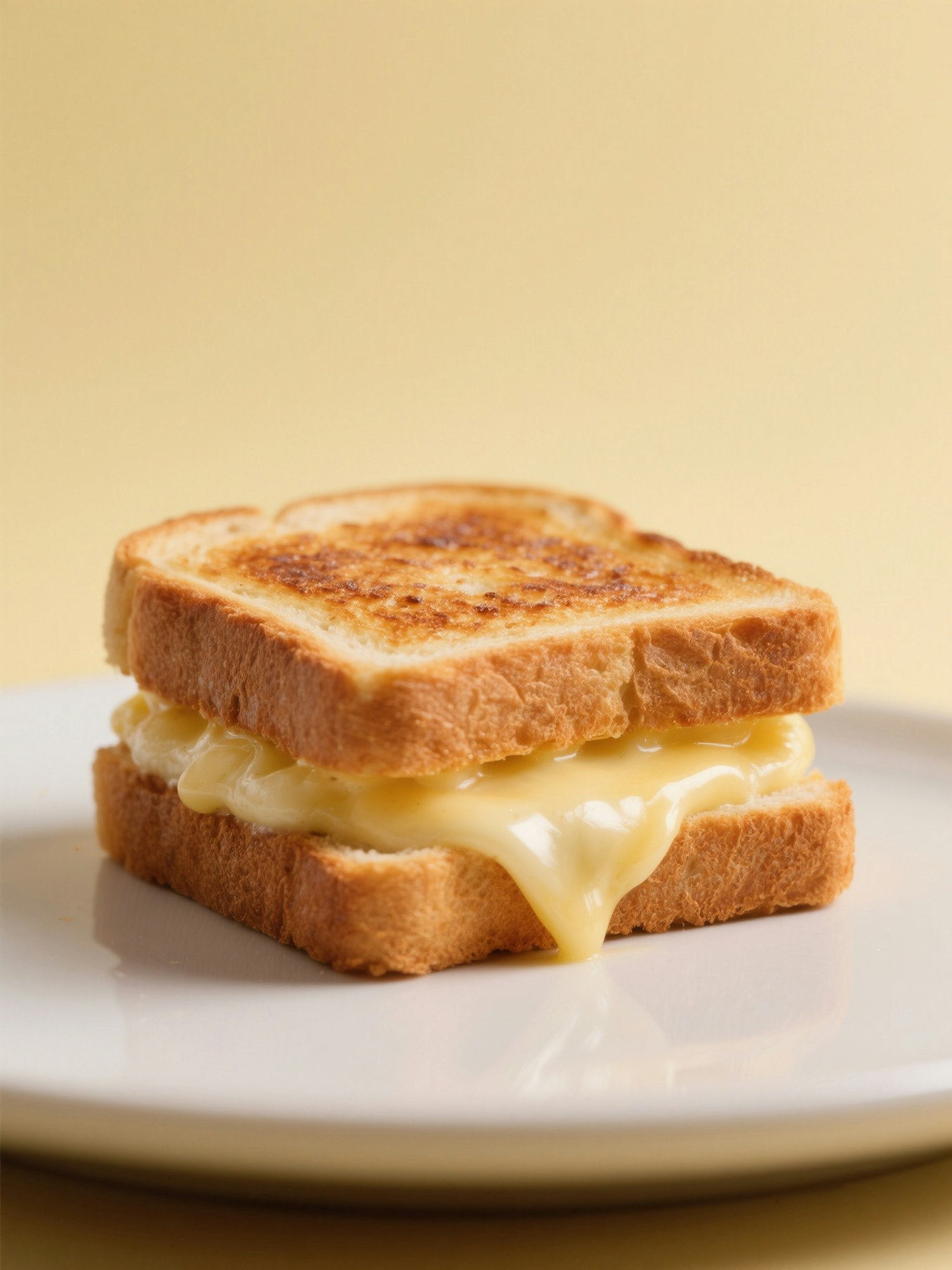 Golden-brown grilled cheese sandwich with gooey melted cheese on a white plate, set against a soft yellow background.