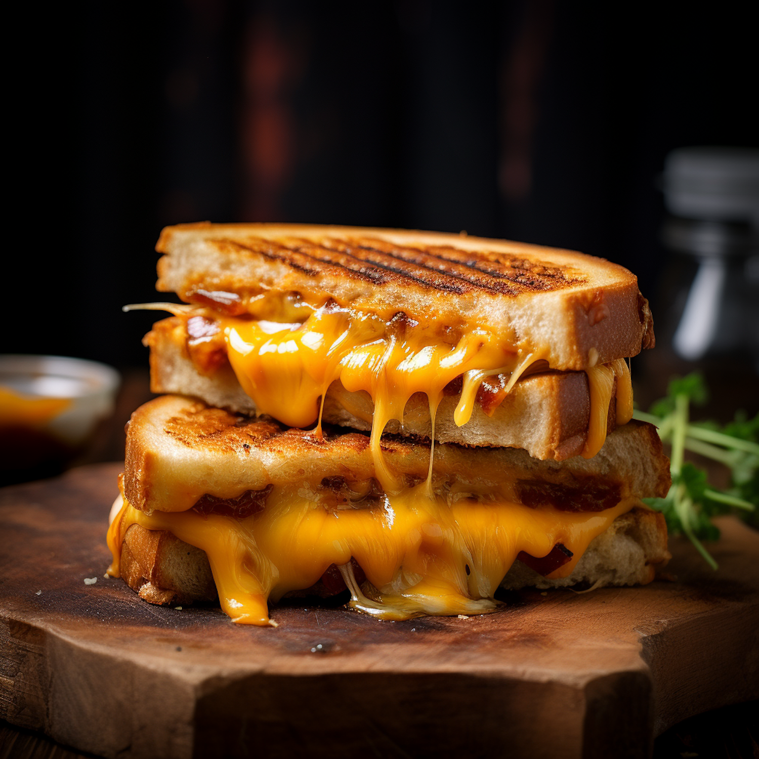 Delicious grilled cheese sandwich with melted cheddar on toasted bread, oozing with flavor. Perfect comfort food on a wooden board.