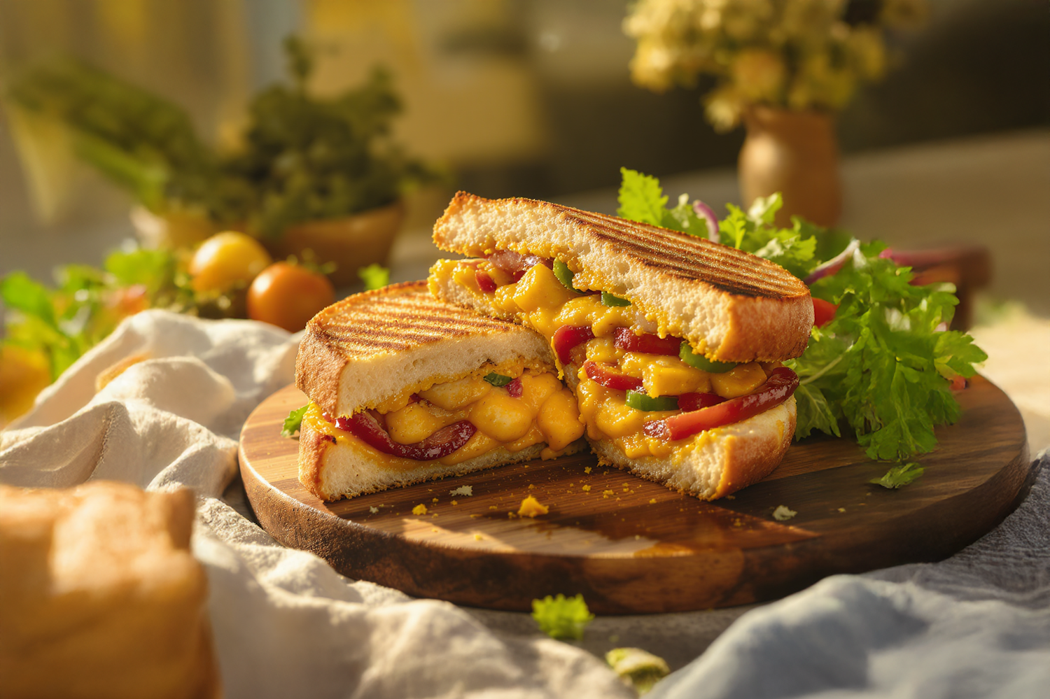 Delicious grilled cheese sandwich with melted cheese, peppers, and fresh greens on a wooden plate, perfect for a cozy meal.