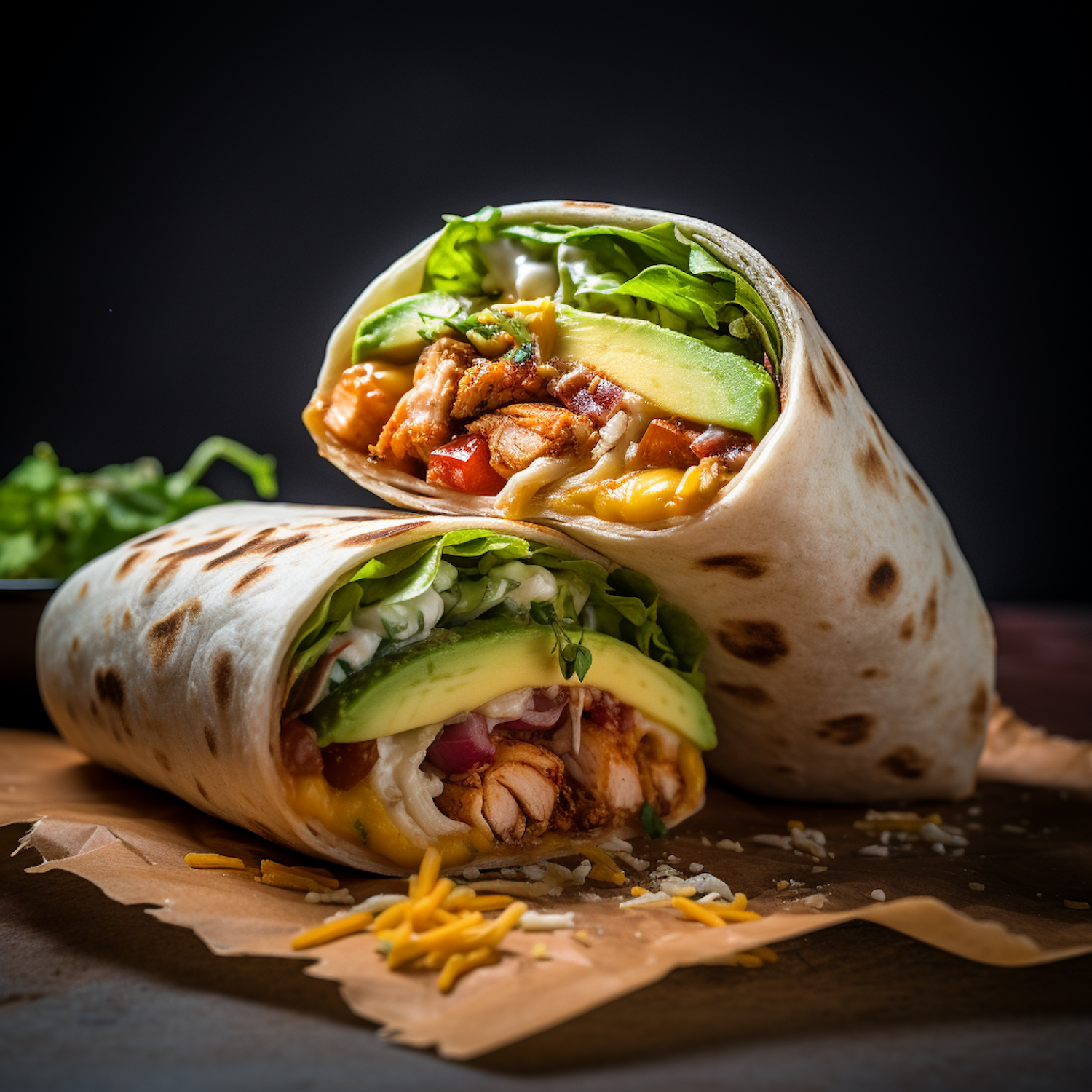 Close-up of two burritos filled with grilled chicken, avocado, lettuce, tomatoes, and cheese, wrapped in toasted tortillas.