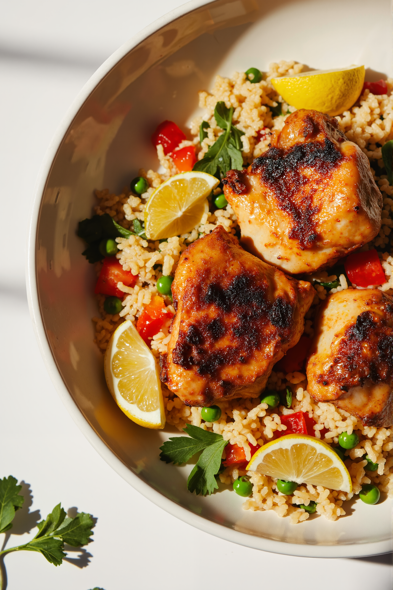Grilled chicken thighs on a bed of couscous with peas, red peppers, parsley, and lemon wedges for a fresh, colorful meal.