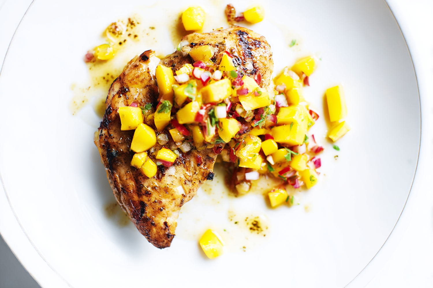 Grilled chicken breast topped with fresh mango salsa, featuring diced mango, red onion, and herbs, served on a clean white plate.
