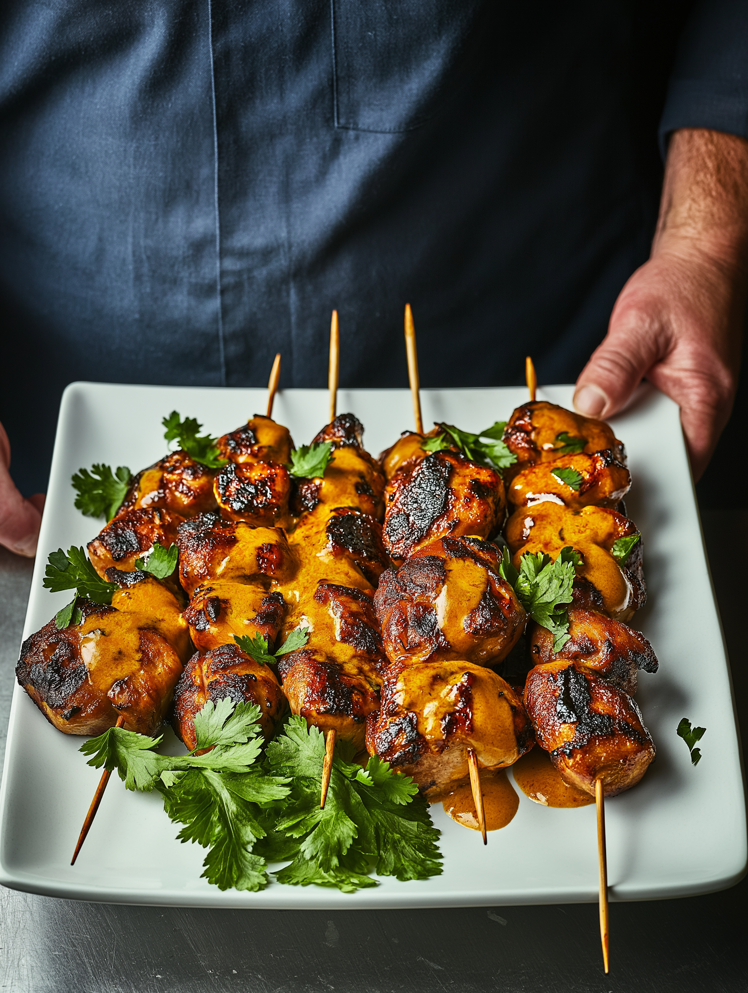 Grilled chicken skewers with a golden glaze and fresh cilantro on a white plate, held by a person in a dark blue shirt.