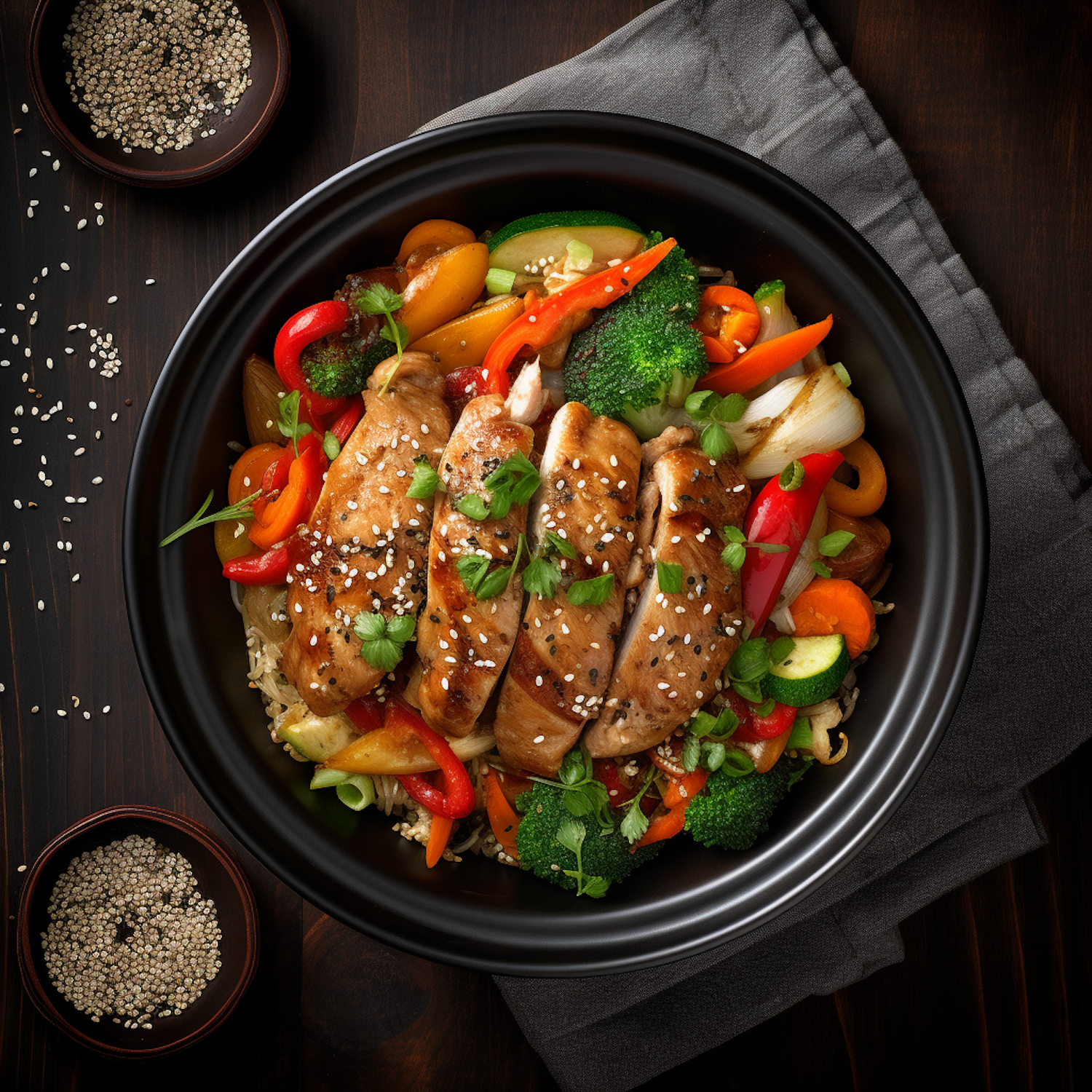 Grilled chicken with sesame seeds and colorful vegetables in a black bowl on a wooden table, garnished with cilantro.