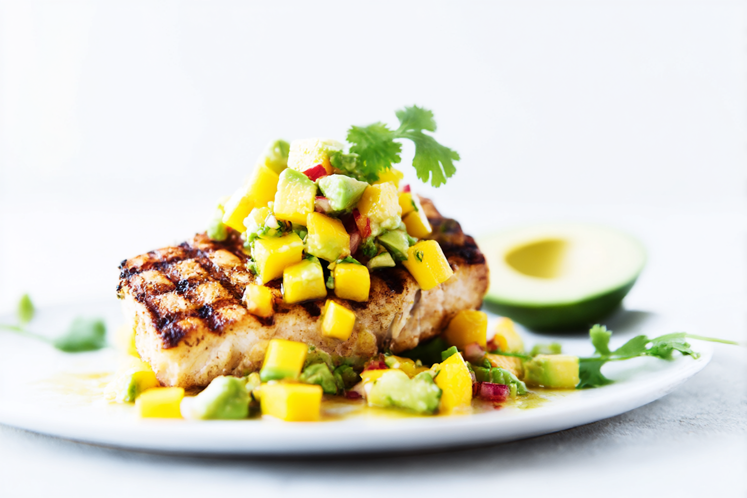 Grilled fish topped with a vibrant mango and avocado salsa, garnished with cilantro, served on a white plate with a halved avocado nearby.