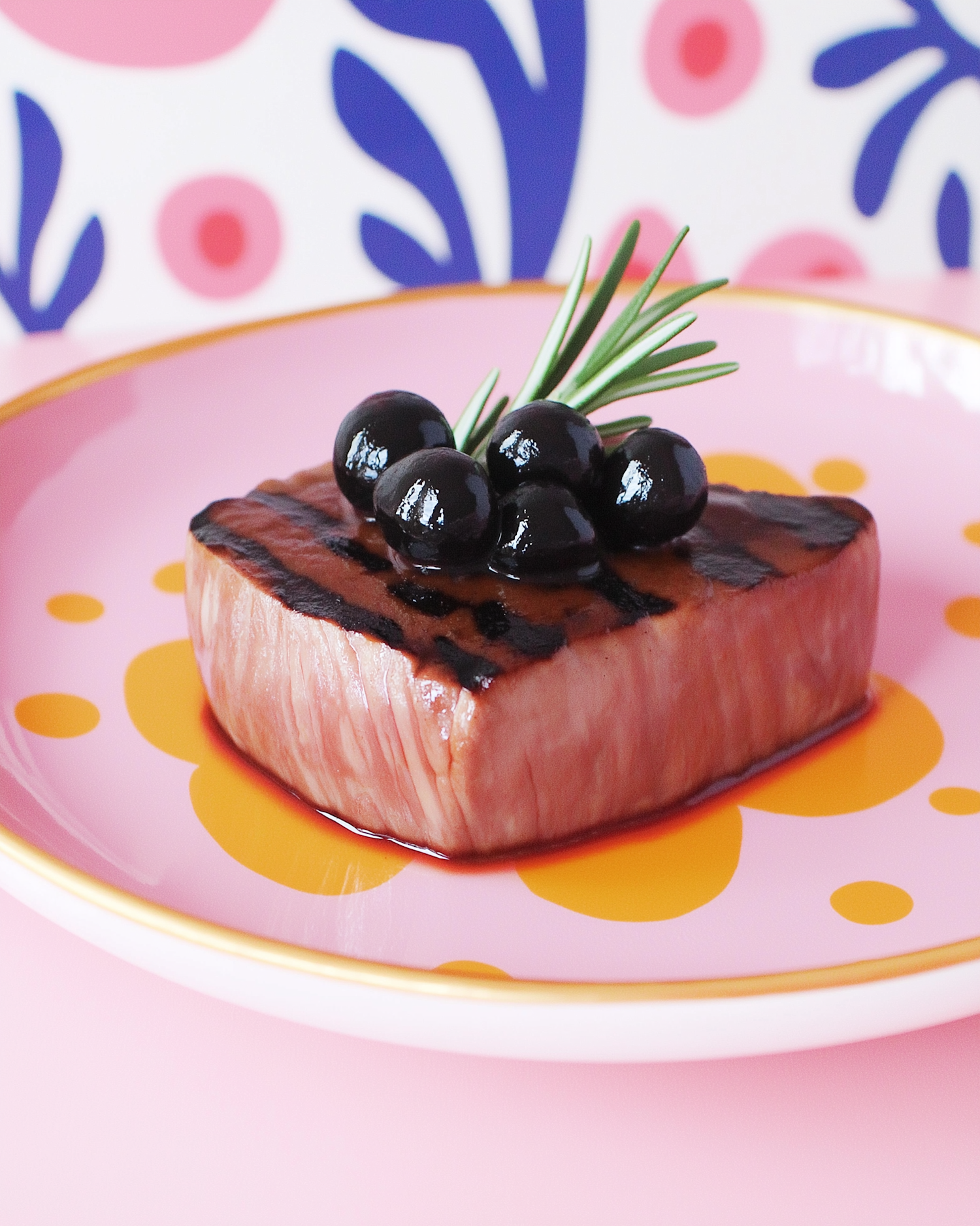 Grilled meat topped with black olives and rosemary on a vibrant pink plate with a colorful abstract background.