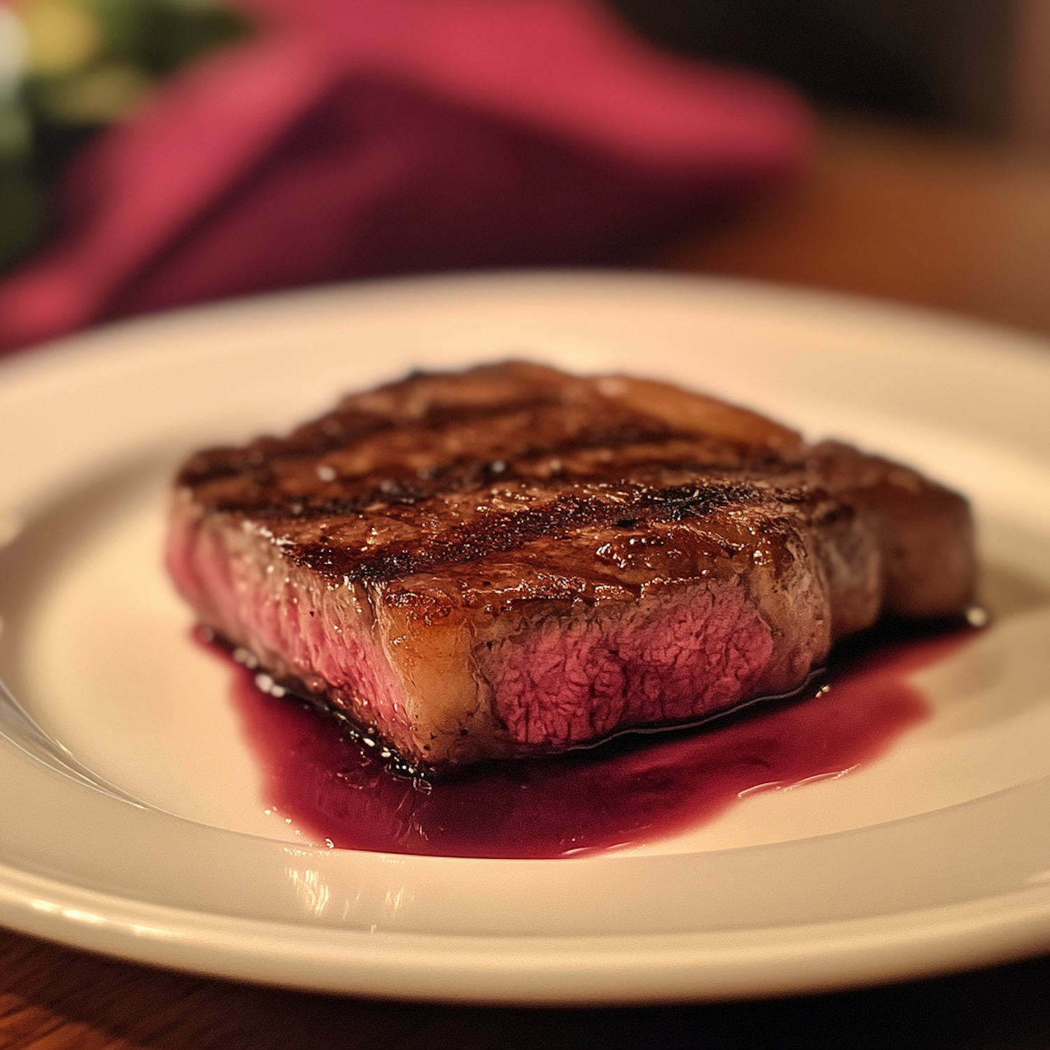 Juicy medium-rare steak with grill marks and red wine reduction on a white plate, set against a warm, blurred background.
