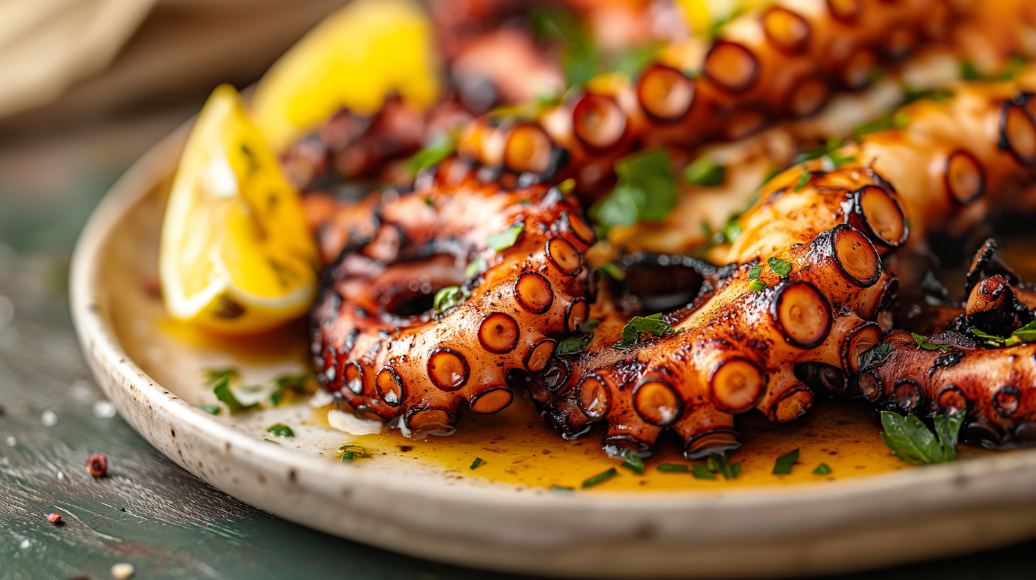 Grilled octopus tentacles garnished with herbs and lemon on a rustic plate, showcasing culinary artistry and vibrant flavors.