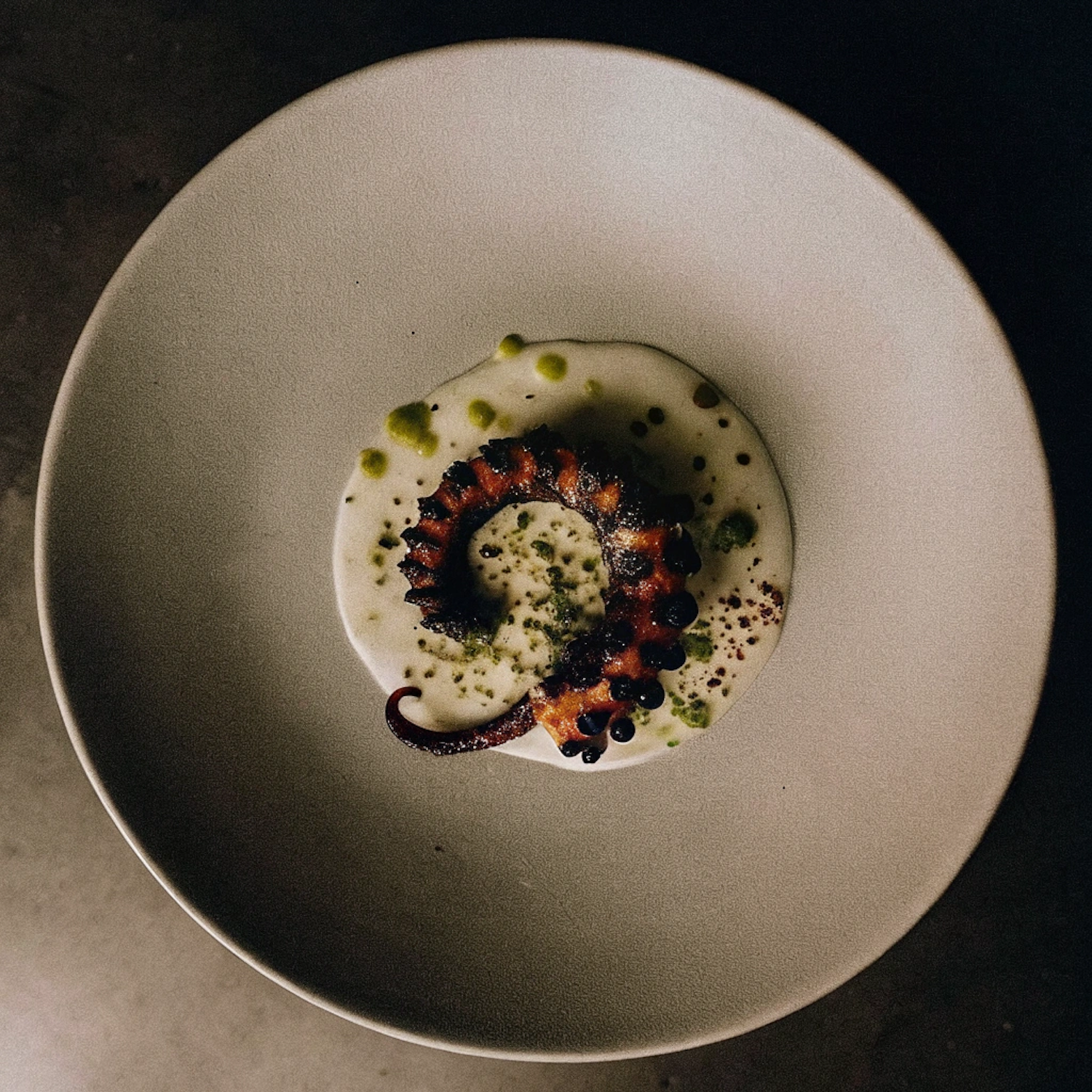 Grilled octopus tentacle on creamy white sauce, garnished with herb oil and spices, served on a minimalist plate for a gourmet touch.