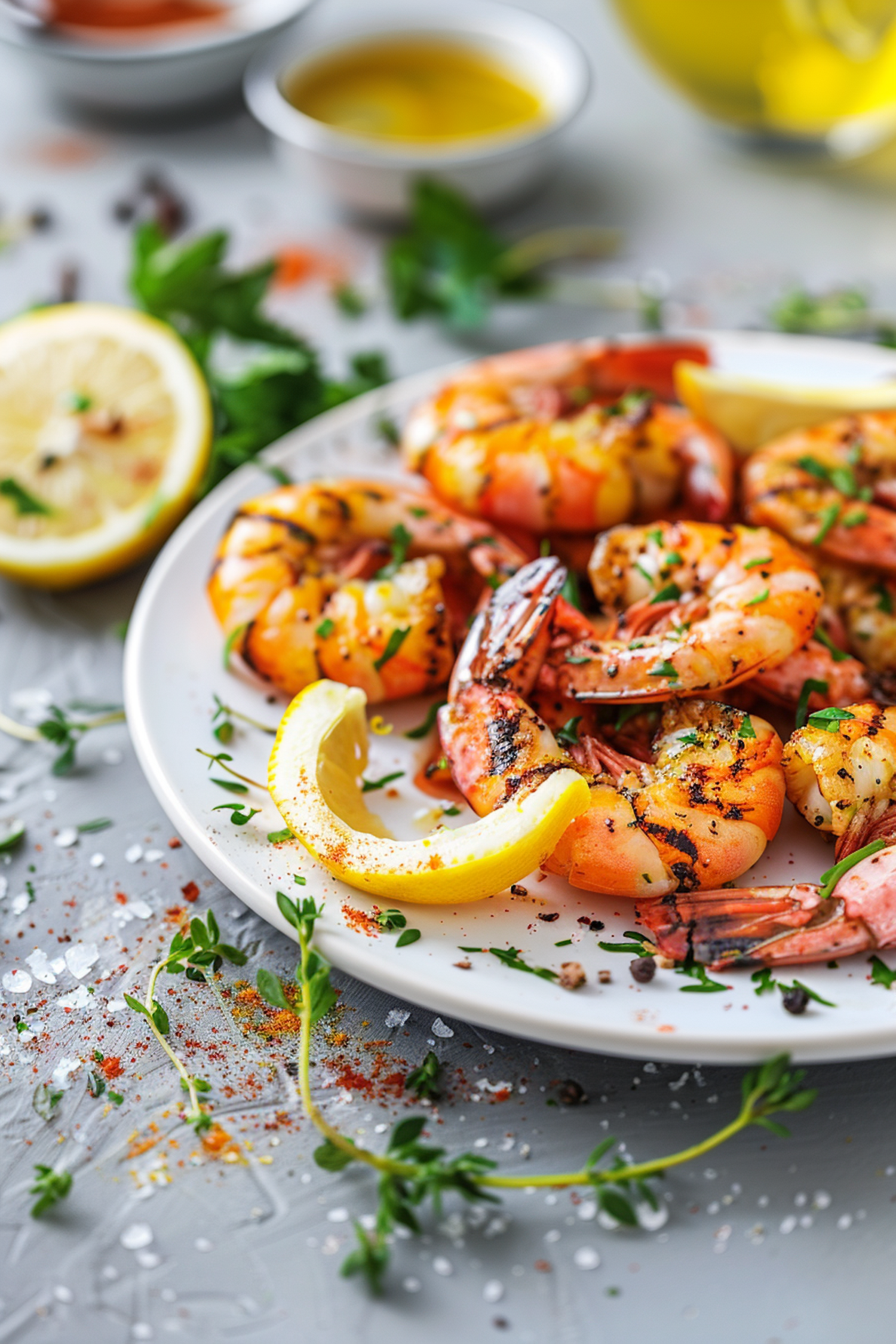 Grilled shrimp with herbs and lemon on a plate, garnished with coarse salt and pepper. Vibrant colors and appetizing presentation.