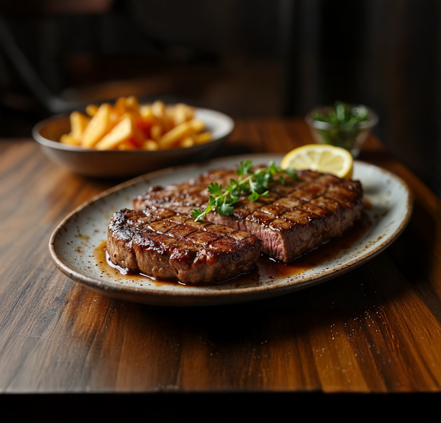 Juicy grilled steak with herbs and lemon on a rustic plate, accompanied by crispy fries on a wooden table.