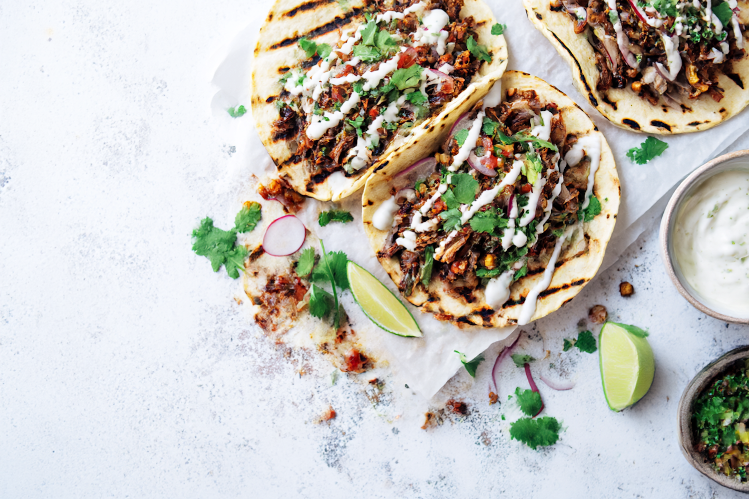 Grilled tacos filled with seasoned meat, fresh veggies, and creamy sauce, served with lime wedges and garnished with cilantro.