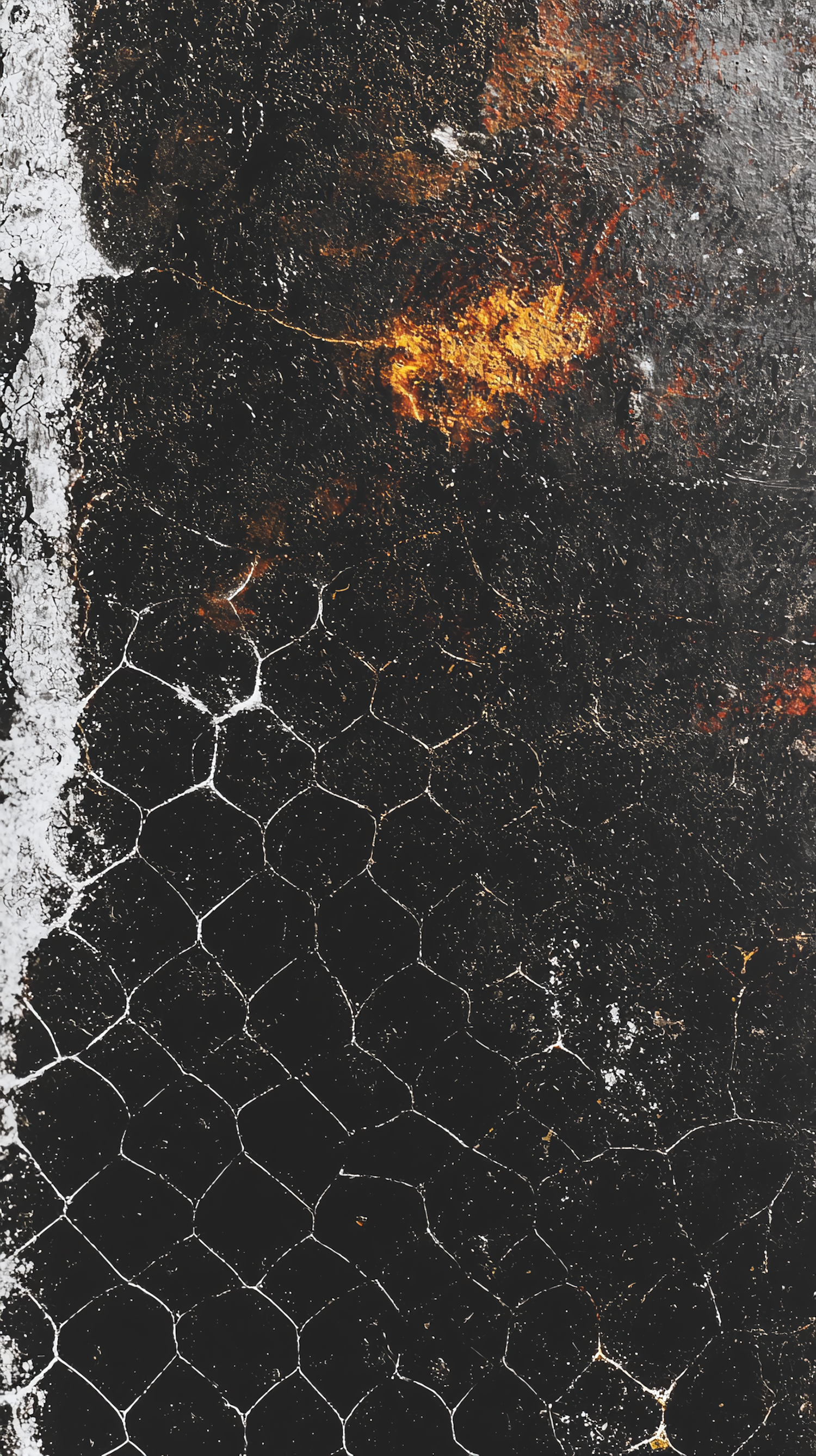 Rustic textured surface with hexagonal wire mesh, dark tones, and fiery orange accents for an industrial, weathered aesthetic.