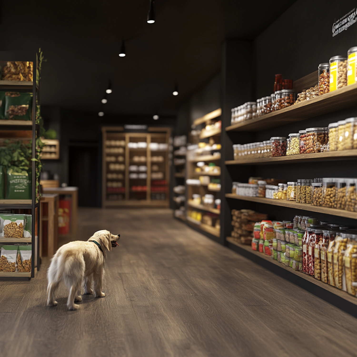 Golden retriever in a modern grocery store aisle, surrounded by neatly stocked shelves of jars and snacks.