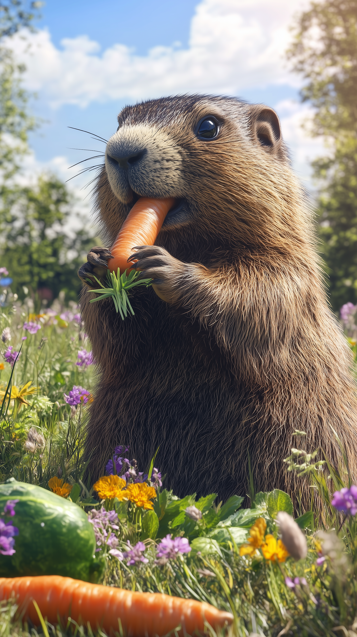 A cute groundhog munching on a carrot in a vibrant meadow filled with colorful wildflowers under a sunny blue sky.