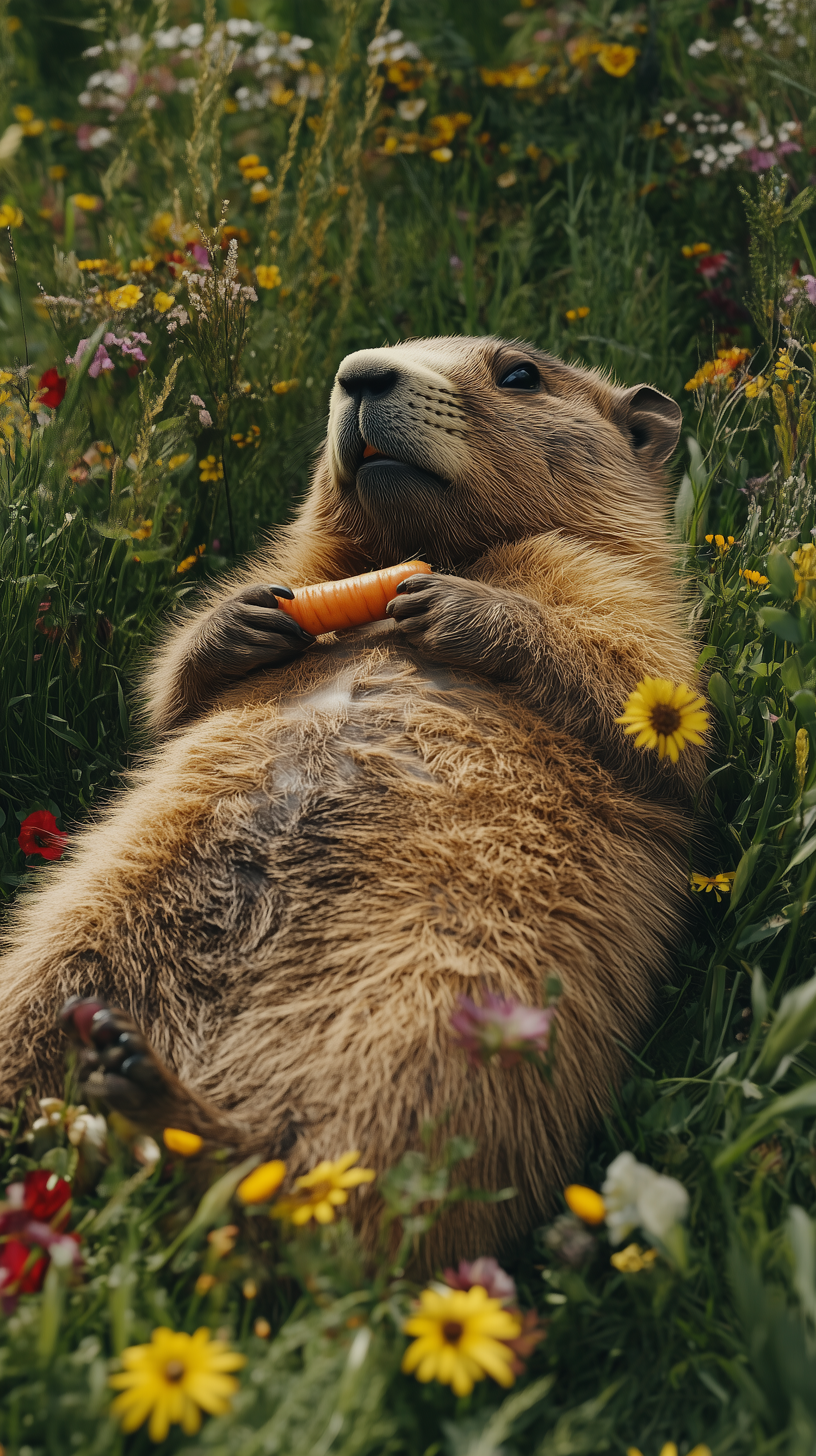 Groundhog relaxing in a meadow, holding a carrot amidst vibrant wildflowers. A serene and colorful nature scene.