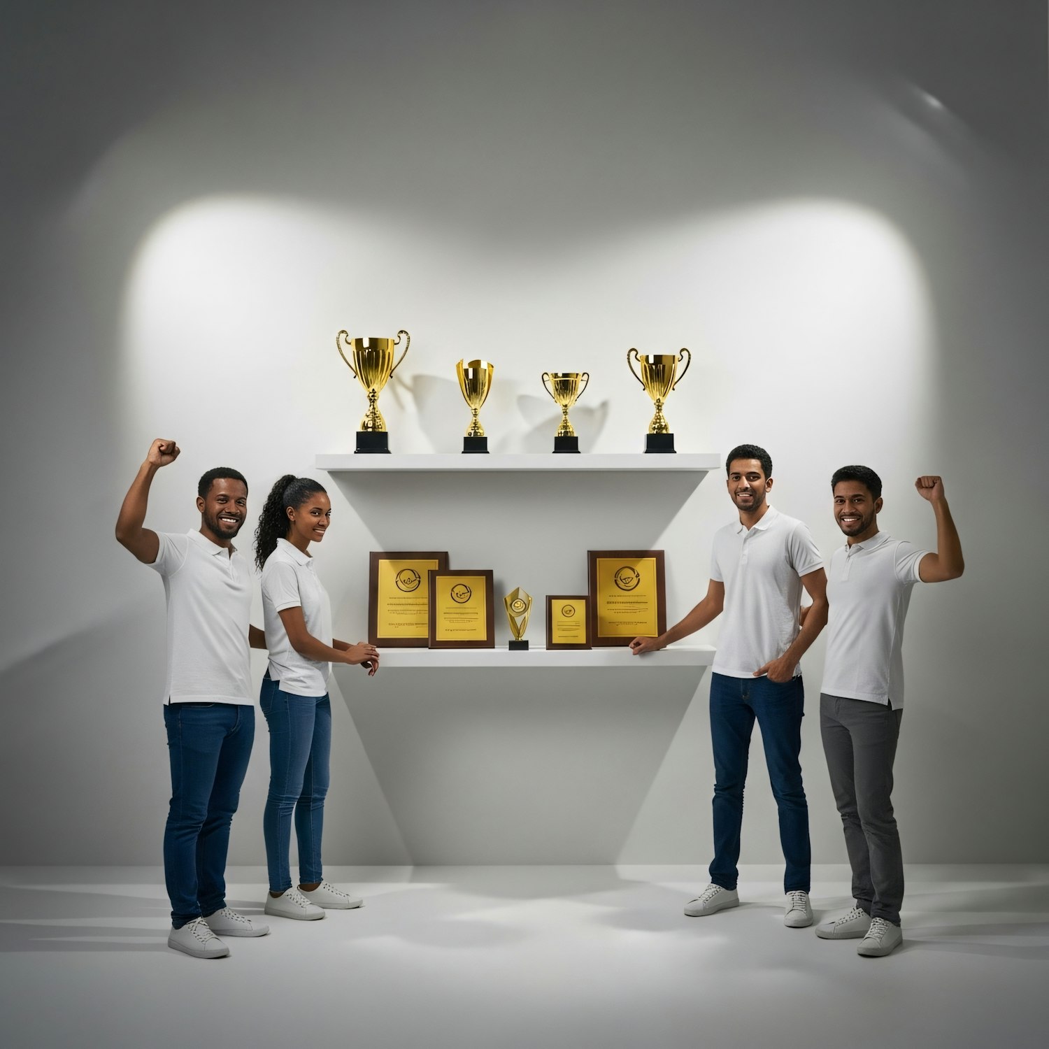 A group of four people celebrating in front of a display of gold trophies and plaques, dressed casually in white shirts and jeans.