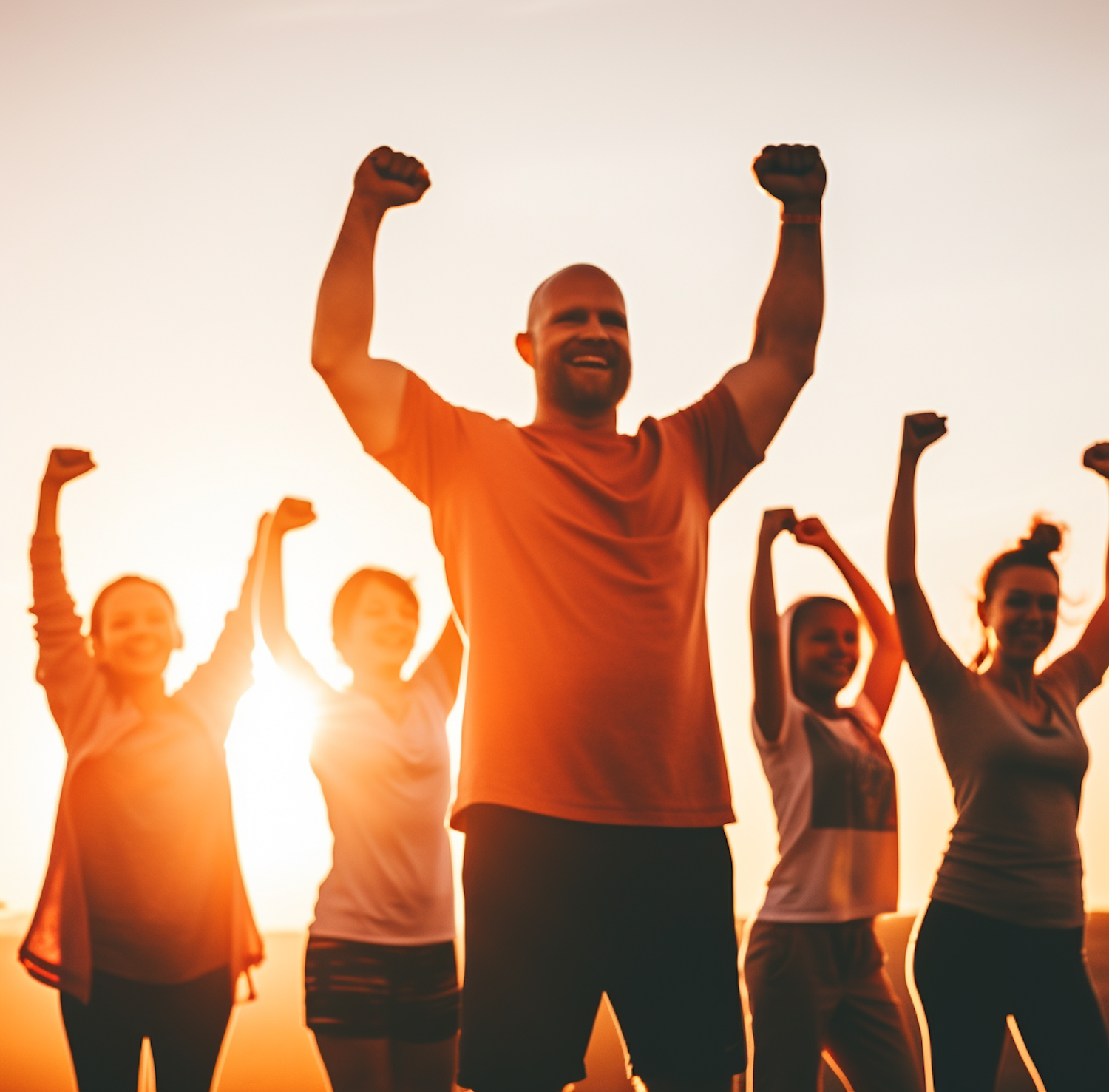 Group of people celebrating with raised arms against a sunset backdrop, exuding joy and unity.